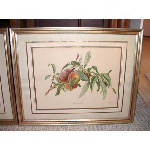 Pair of old fruit prints in beautiful gold and bronze colored frames. Approximately 30" wide by 24" tall. Print sheets are little wavy and not really noticeable. Overall in very good condition. Bright striking colors.