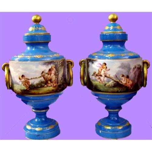 Pair of Old Paris Blue Lidded Vases, Puttis #1496712