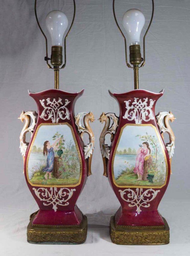 With griffon handles. Decorated with handpainted woman. Vases approx. 15" H, 30" up to finial. Chips on bottom.