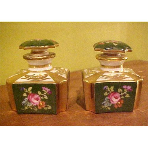 Here we have a lovely pair of hand painted Old Paris scent bottles dating to the late 19th century. The two bottles are identical, each having dark green panels painted with a little spray of roses and other flowers. The stopper of each bottle is dark green with a spray of roses also. The corners of the bottles are notched with gilt enameling and the top is gilt enameled in a foliate design. One bottle is perfect. The other has had some rubbing of the gilding at the opening, and appears to have been retouched. The bottles are approximately 2.5" high.
