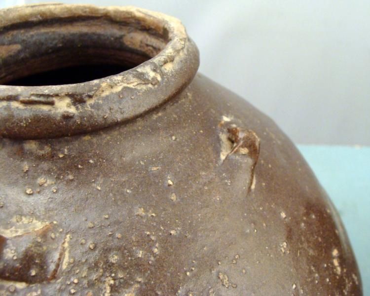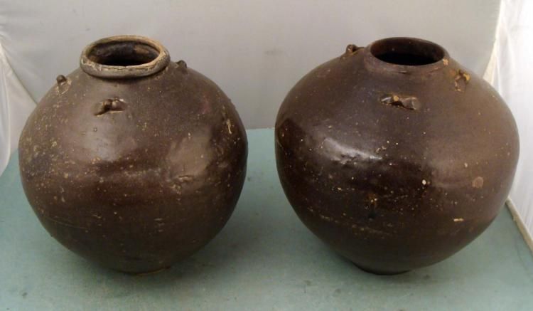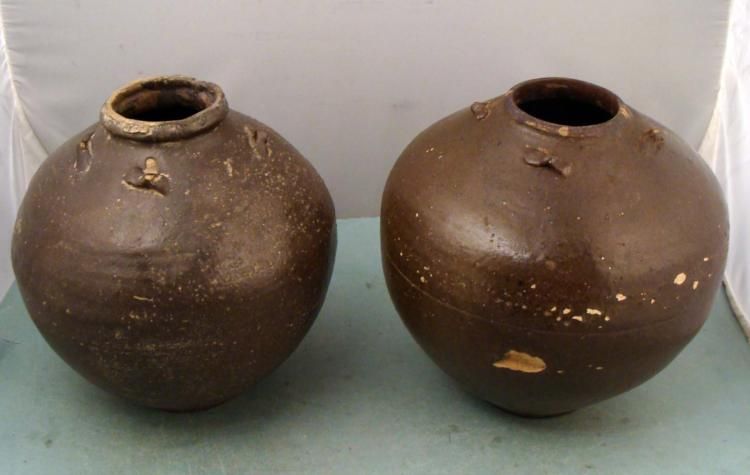 Here are two old urns made of hand formed pottery, with a dark brown glaze. The dimensions are 10 1/2" x 10 1/2" and 10" x 10". Both are in good condition with some wear. * These have a nice rustic look for any pottery collector.