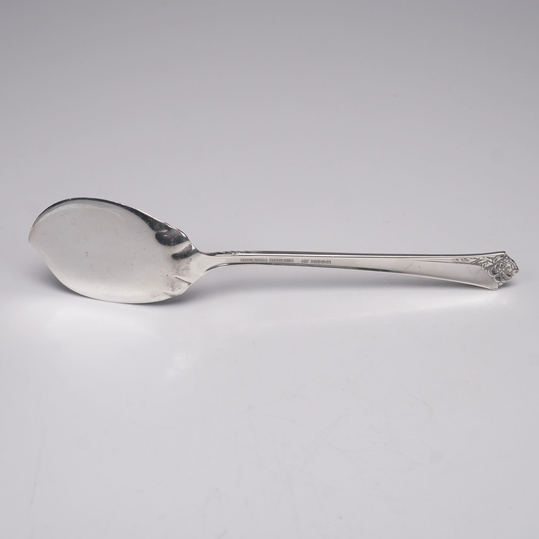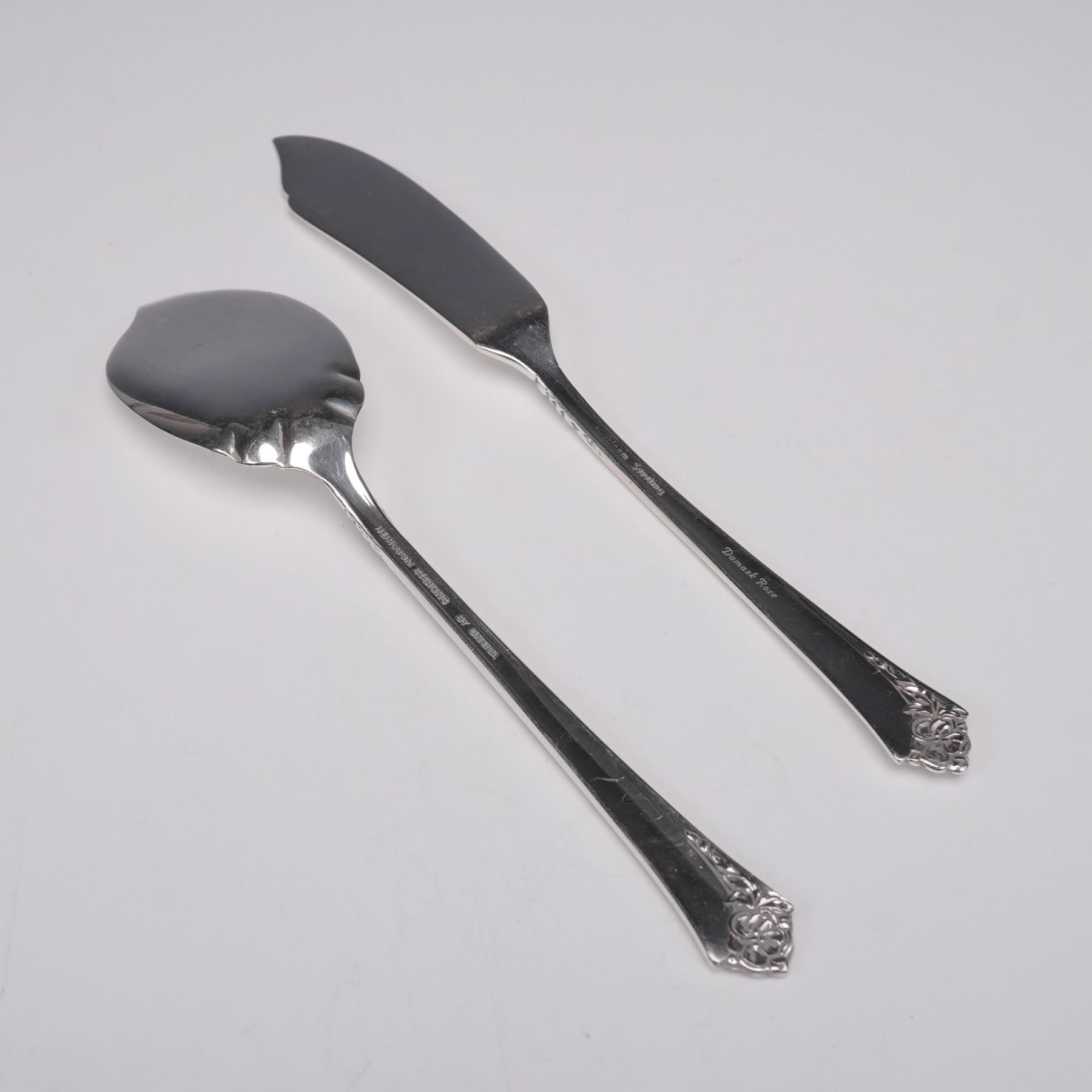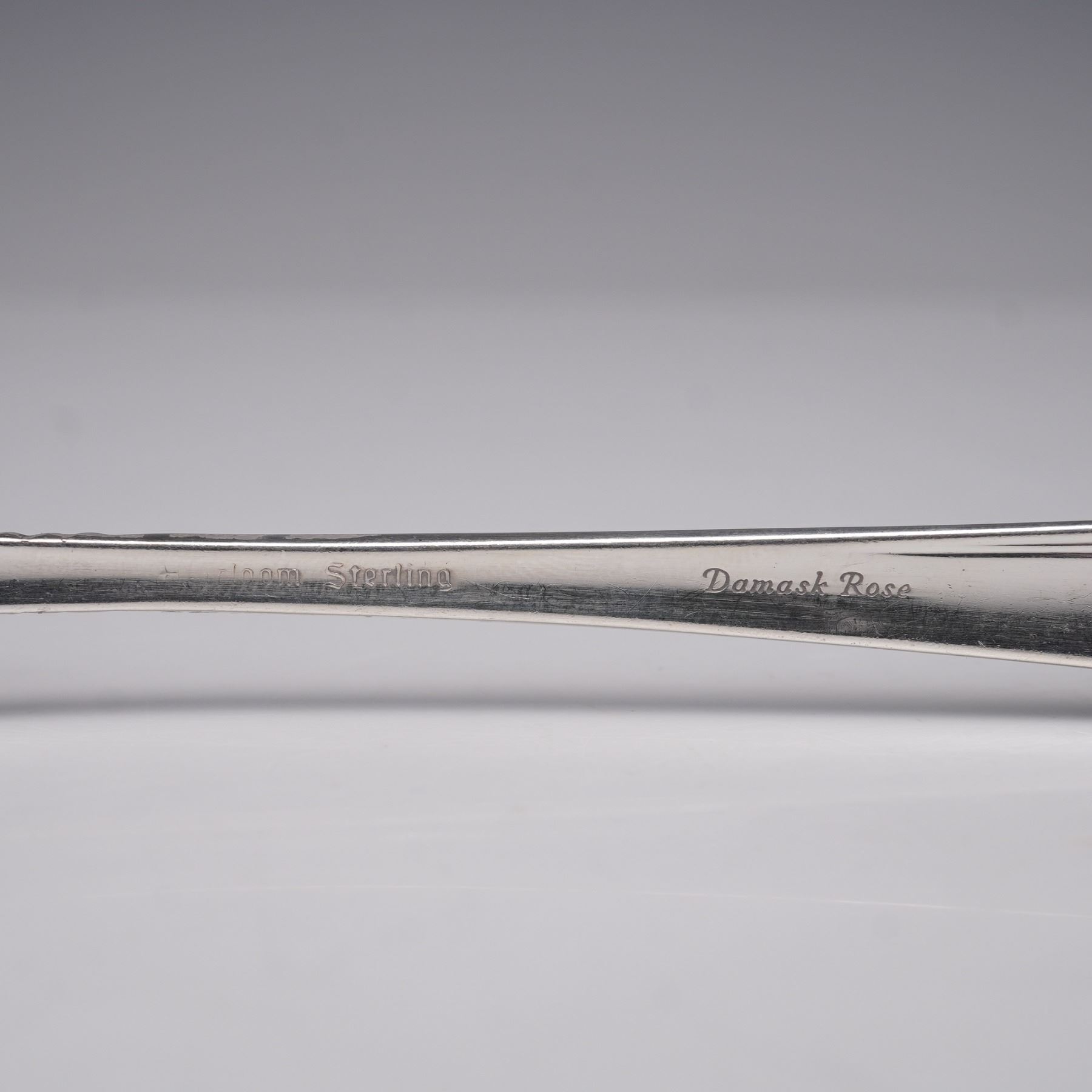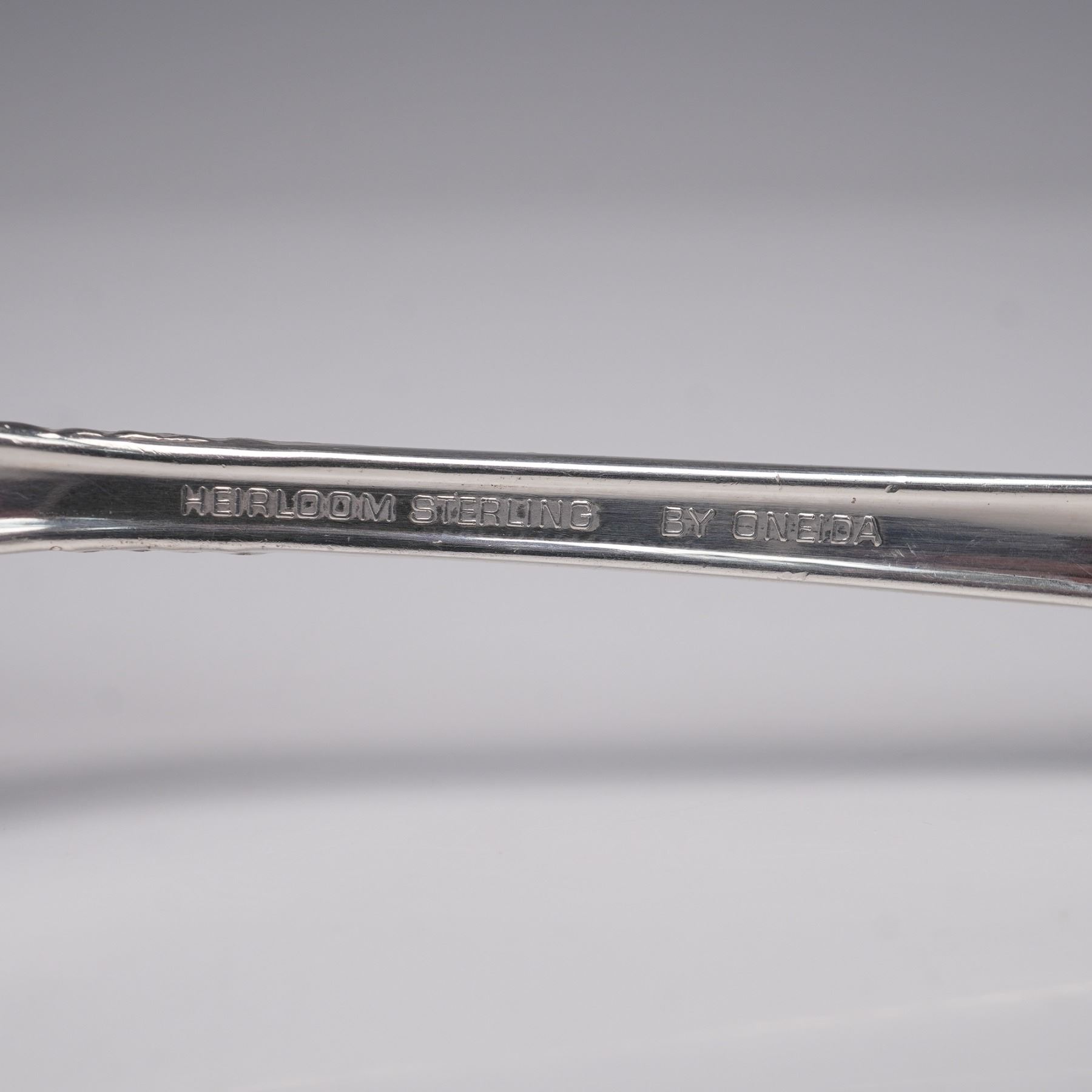 Set of two sterling silver utensils by Oneida in the Damask Rose Heirloom pattern. Includes one jelly spoon and one master butter knife, each with a floral motif at the handle tip and along the handle edges. Marked Heirloom Sterling by Oneida and Damask Rose. The net silver is 1.918ozt. Jelly Spoon: 1.25"L x 0.5"W x 6.5"H. Master butter knife: 1"L x 0.25"W x 7"H.