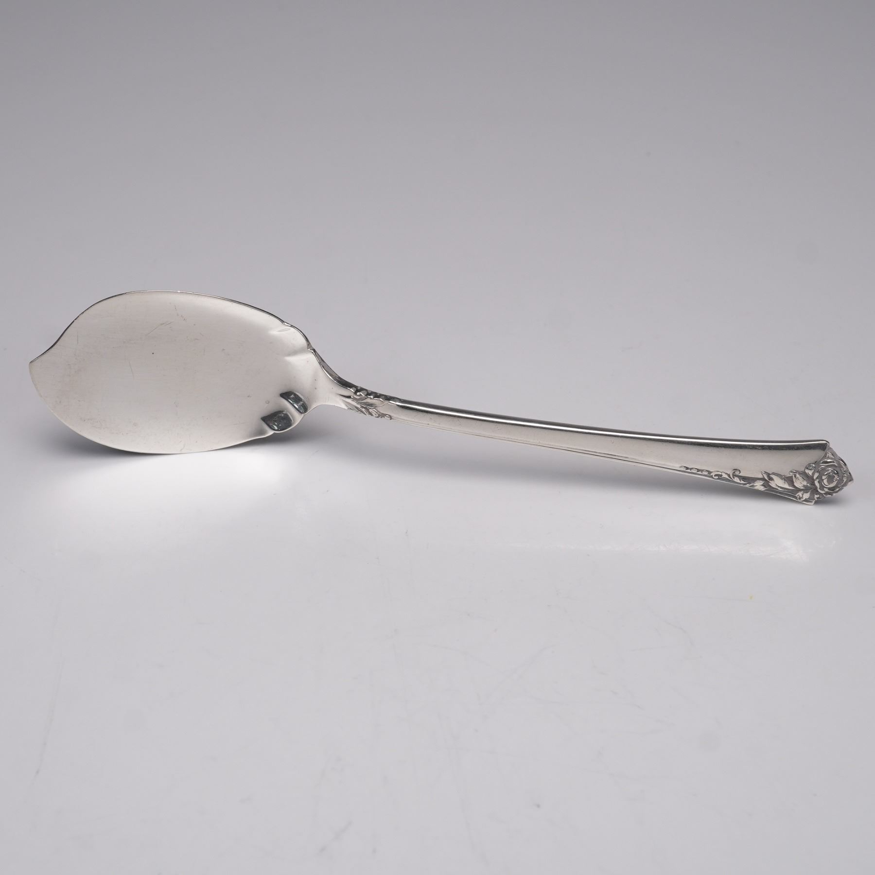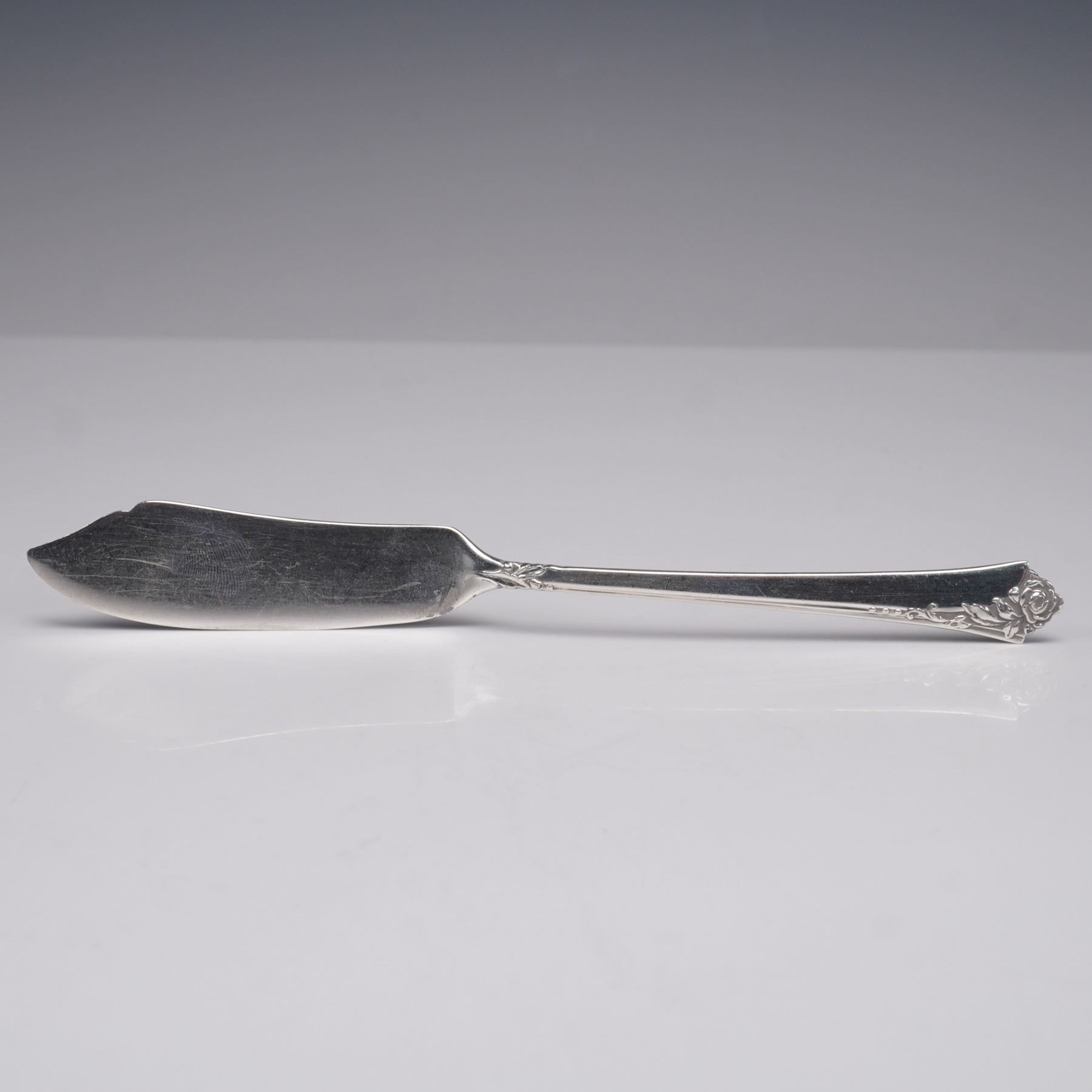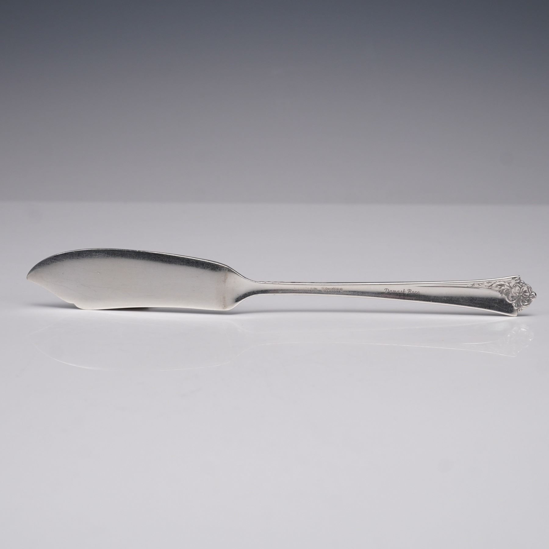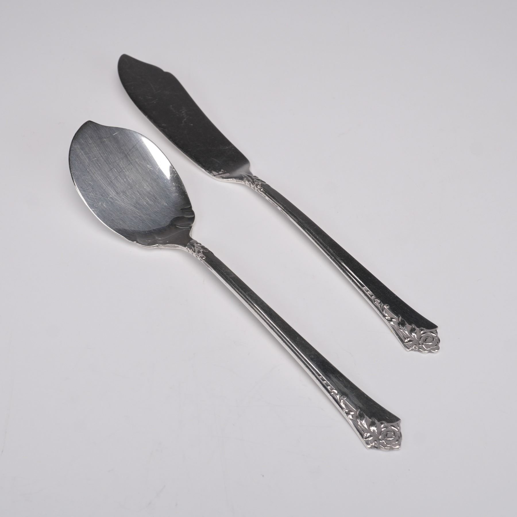 Set of two sterling silver utensils by Oneida in the Damask Rose Heirloom pattern. Includes one jelly spoon and one master butter knife, each with a floral motif at the handle tip and along the handle edges. Marked Heirloom Sterling by Oneida and Damask Rose. The net silver is 1.918ozt. Jelly Spoon: 1.25"L x 0.5"W x 6.5"H. Master butter knife: 1"L x 0.25"W x 7"H.