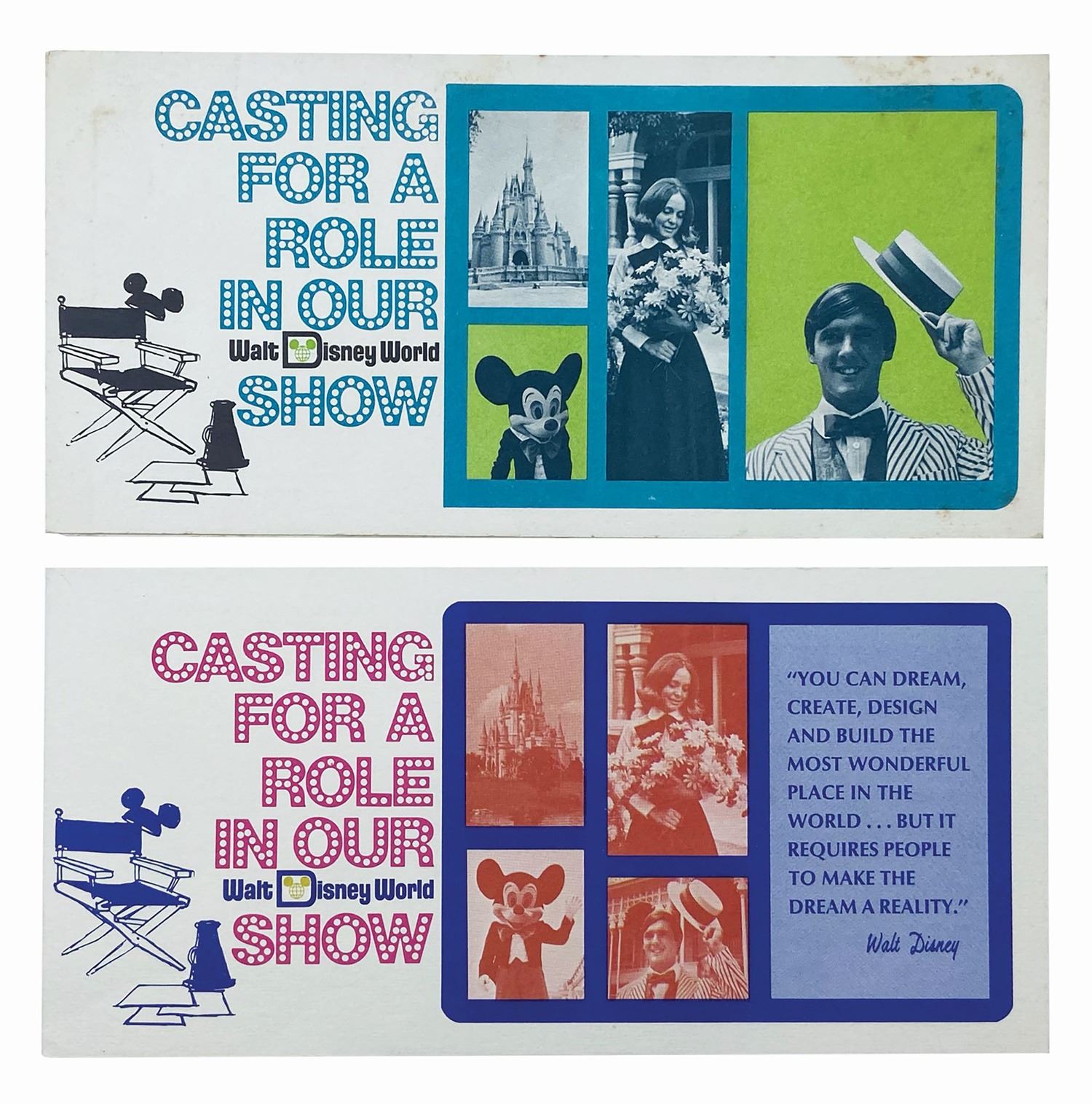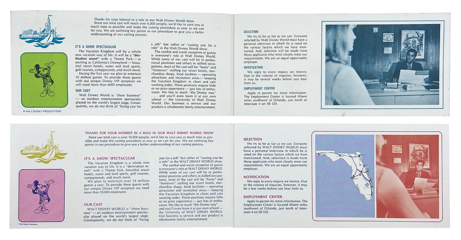 (Walt Disney World, c.1971) A pair of cast member hiring brochures from the opening year of Walt Disney World. The books are similar in content, however one was created before the opening of the park and describes what will be expected when the park opens, while the other was created shortly after the park opened. Each brochure measures 4"x8.5" when folded, and opens to 4"x25.5". The condition is good overall, with the green pre-opening brochure having some discoloration to the reverse.