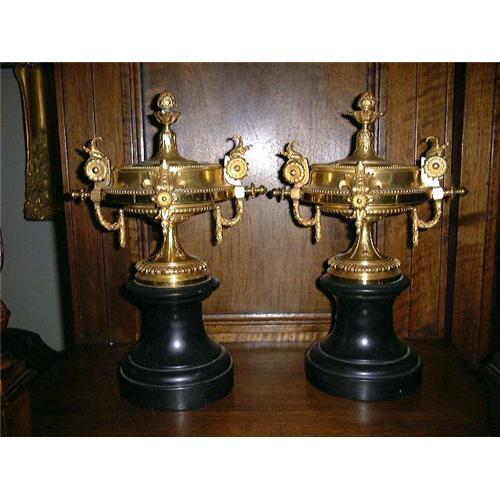 This matching pair of gilt dore bronze and black marble garnitures are beautifully detailed. Note the draped swags and detail around the handles. C. mid 19th century, from France.
