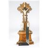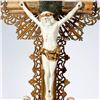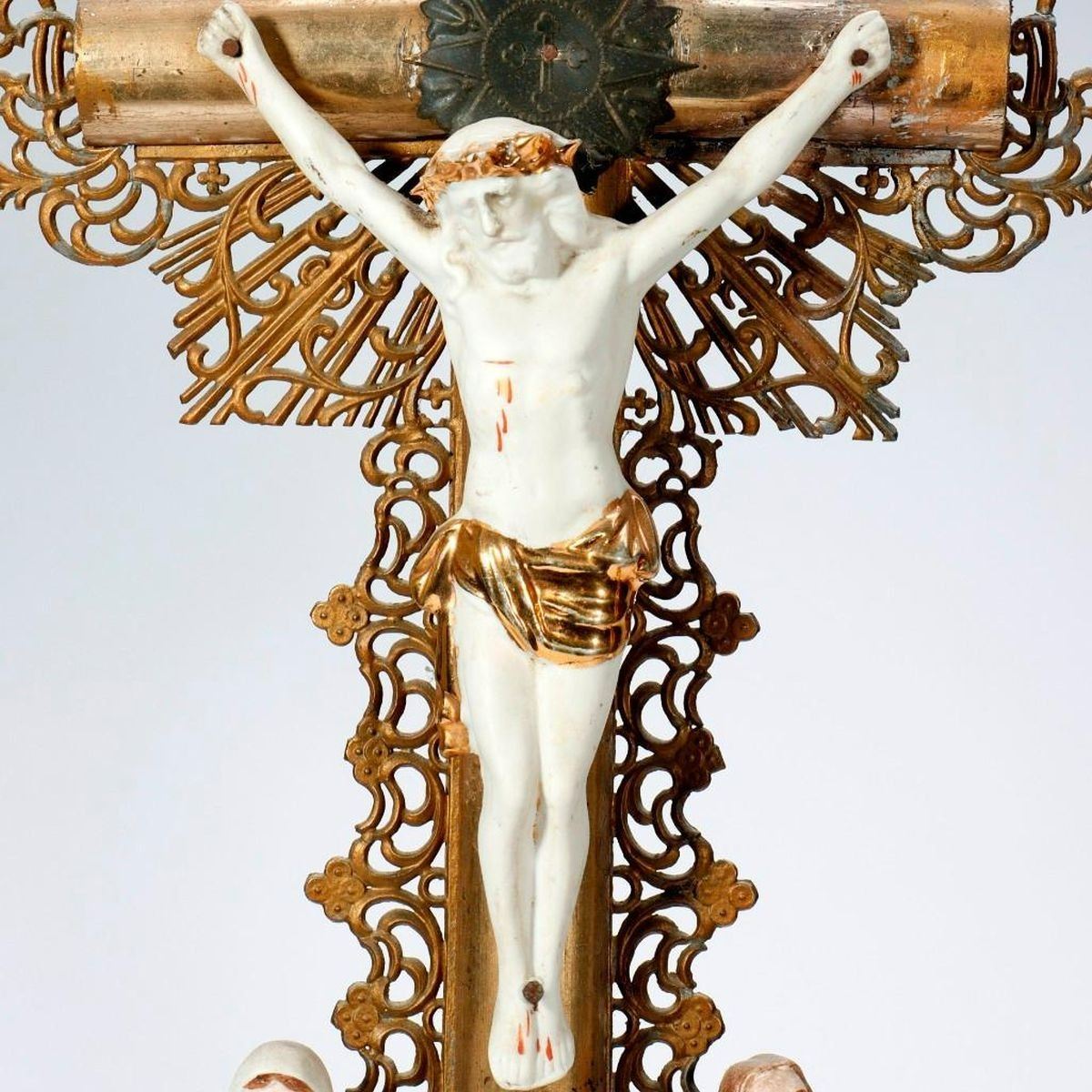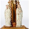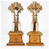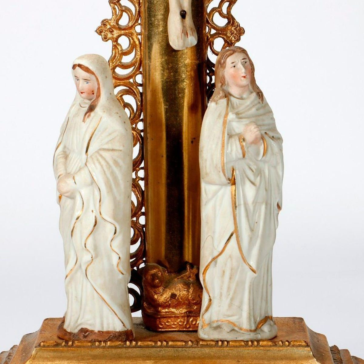 Each with metal rays on the cross, and two loose porcelain figures that fit over wood pegs on the molded giltwood stands. Each approx. 21 1/2in. h. x 9in. w. 4in. d. Condition: One is in better condition than the other, but is missing portions of the metal rays on top. The other has wear, cracks/chips, and missing portions of molding on the base; repairs to gilt; the cross slightly loose in base.