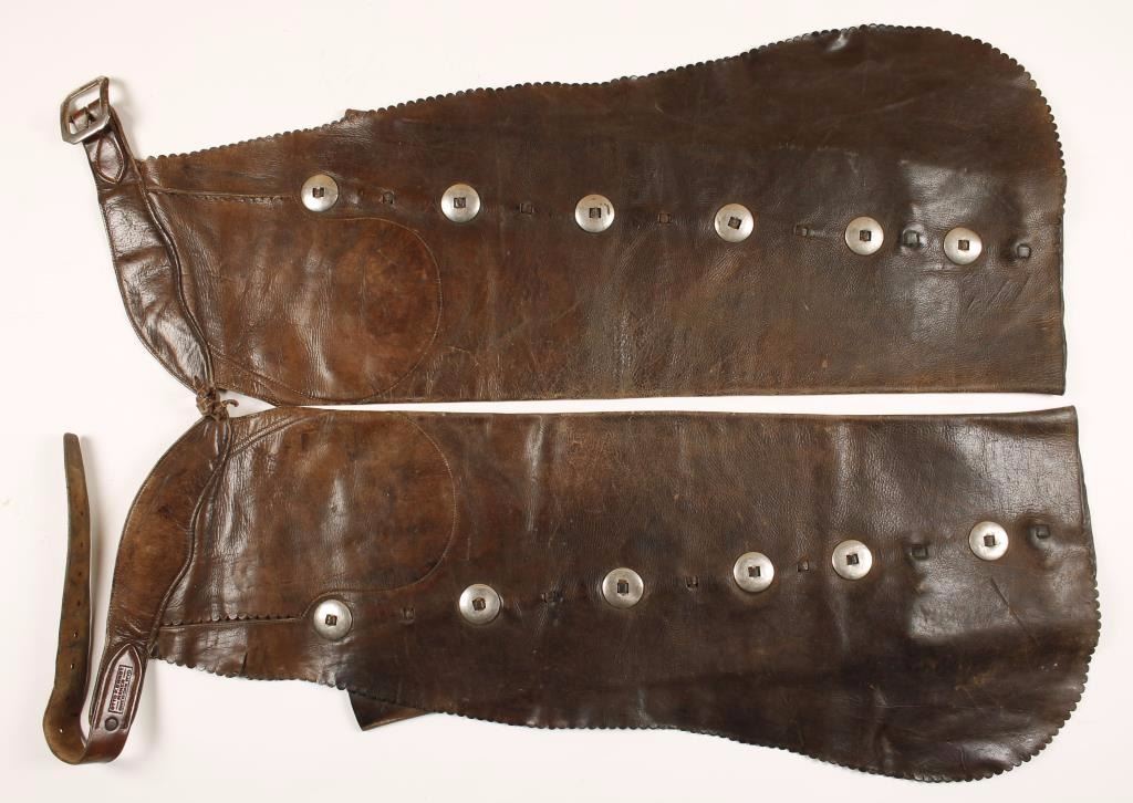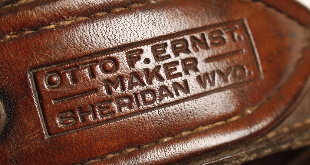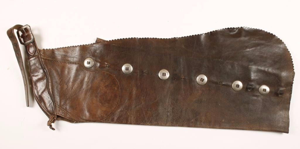 Smooth brown leather with two center pockets with scalloped edges. Twelve nickel plated conchos, maker marked on waistband. Overall good condition.