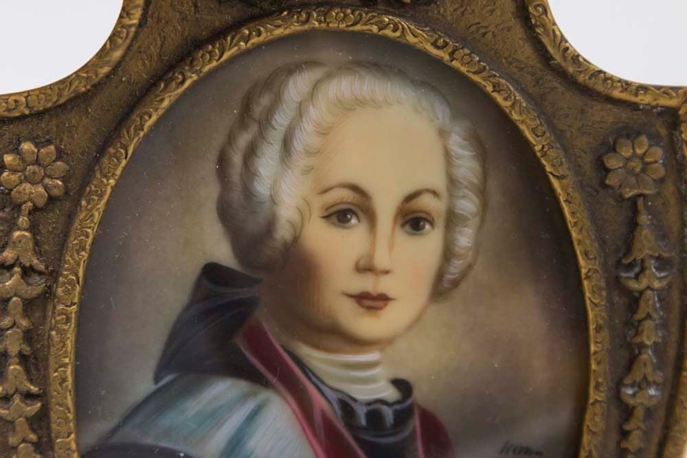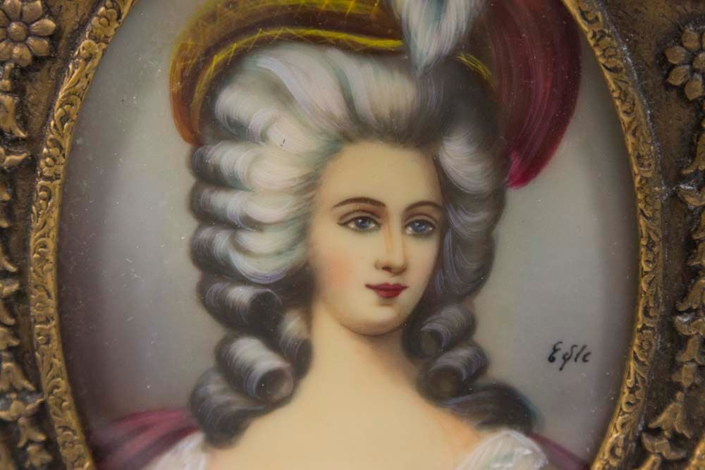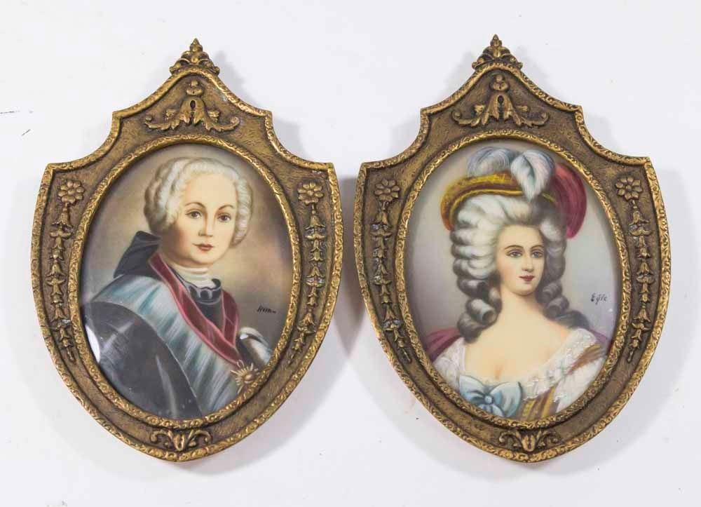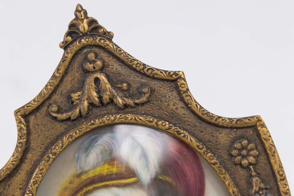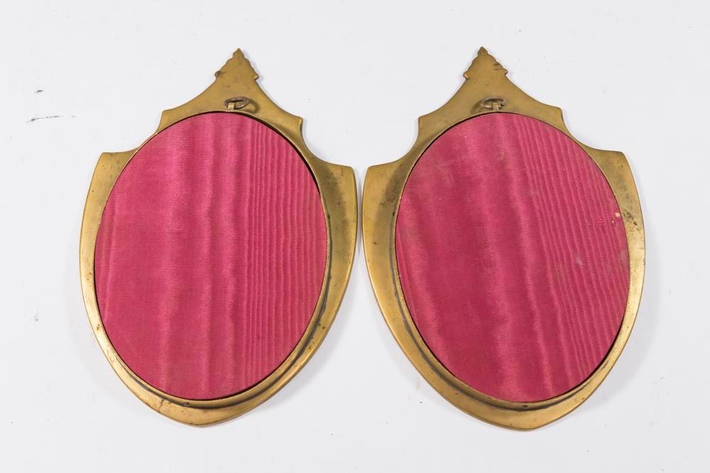 Metal shield shaped frames, artist signed. Approx. 6 1/2" by 4 3/4".