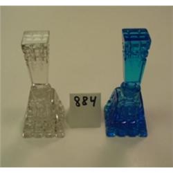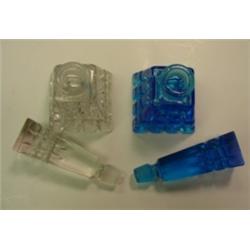 Pair of perfume bottles. One blue and one clear. Matching patterns. Resembles "Cubist". Both with stoppers. 4.5" tall and 1-5/8" wide. Condition: Few tiny edge chips. Not obvious.