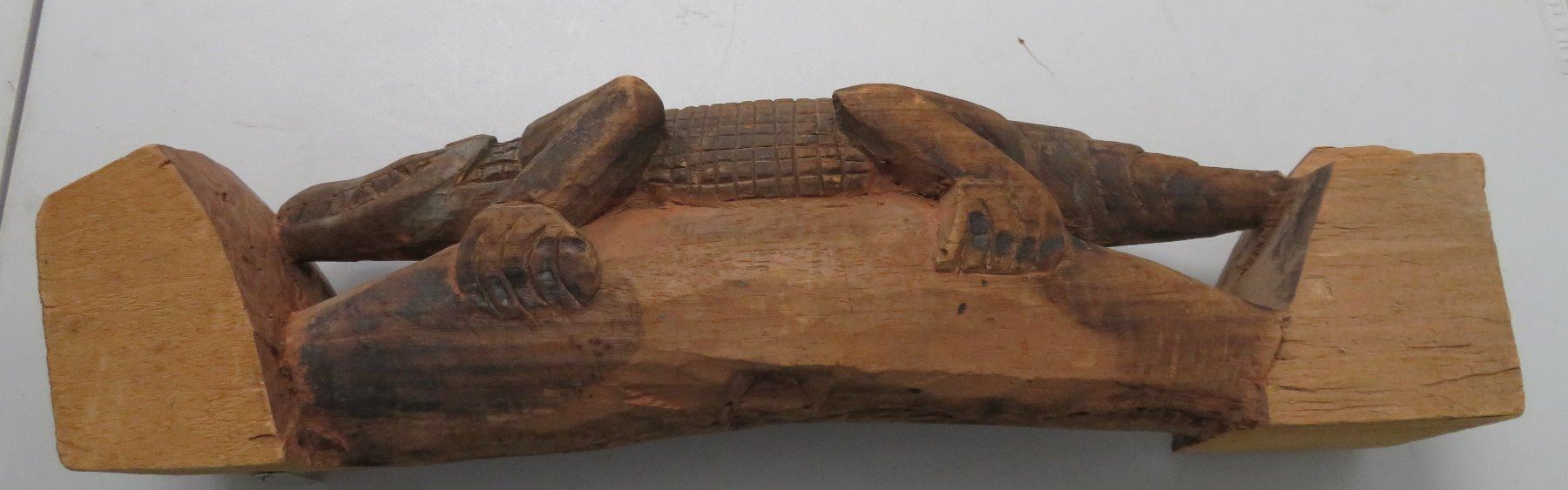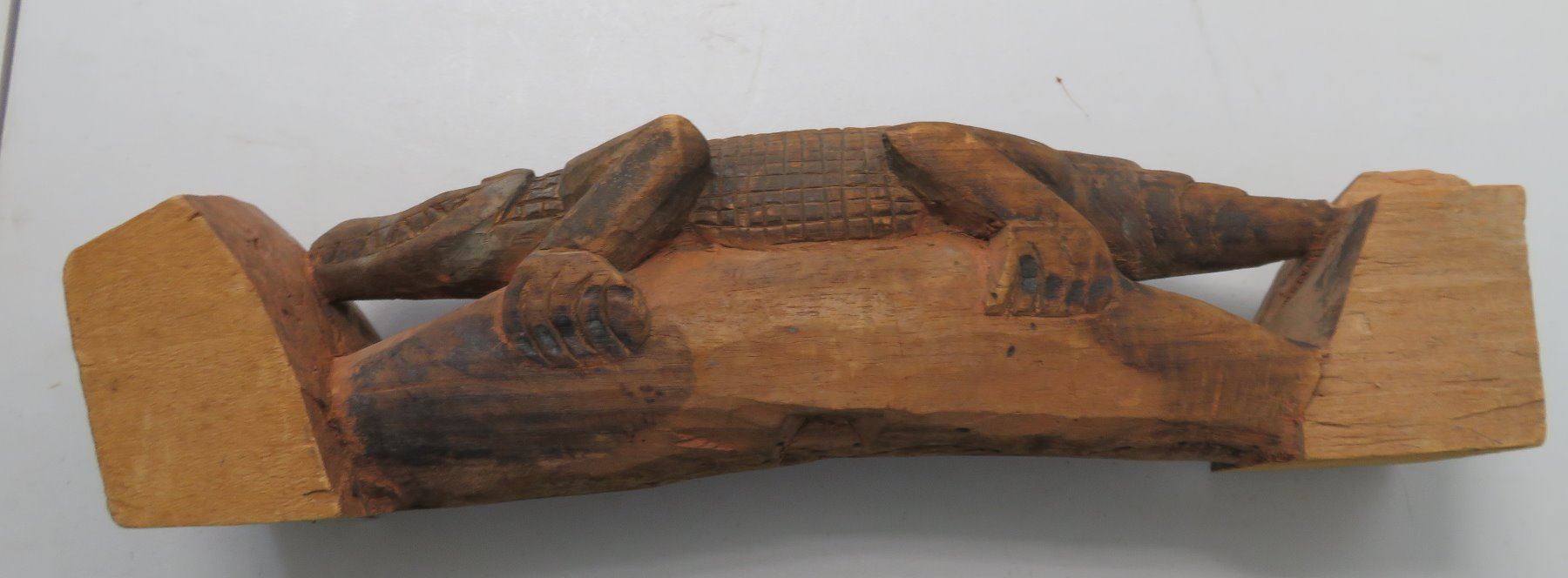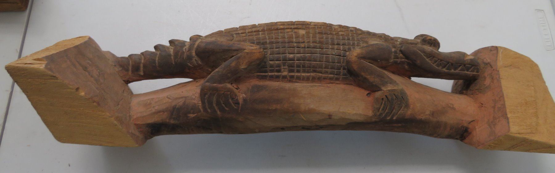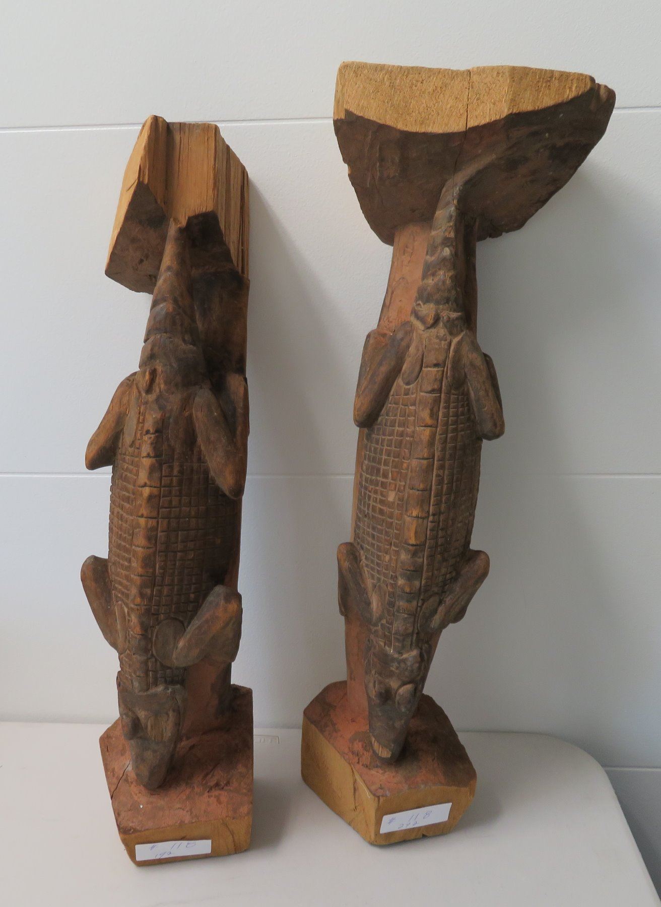 Pair of PNG Alligator Figures, c. 1940s. Made of wood, the items measure approx. 26" x 9" x 7" each. Papua New Guinea. Matched pair of carvings. Condition: As found, see images. Shipping: $65.00 USA estimate only, due to size and weight.