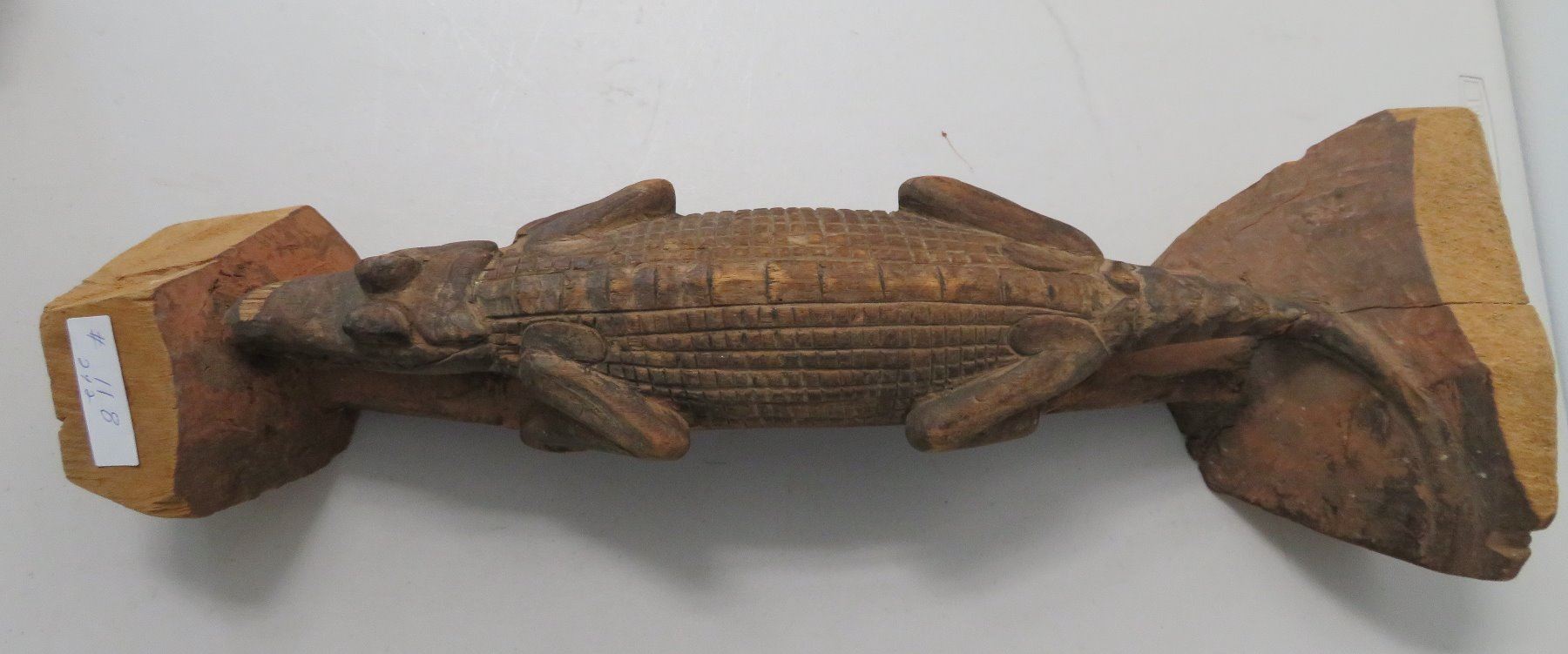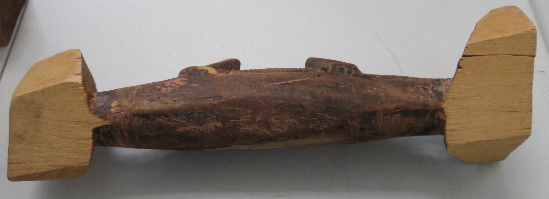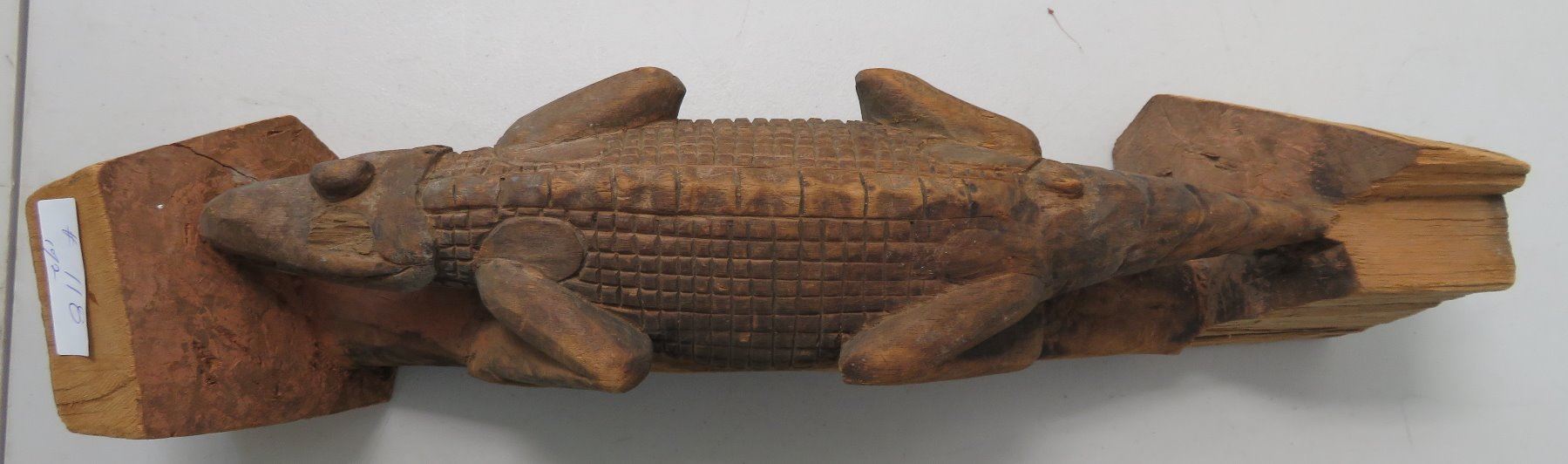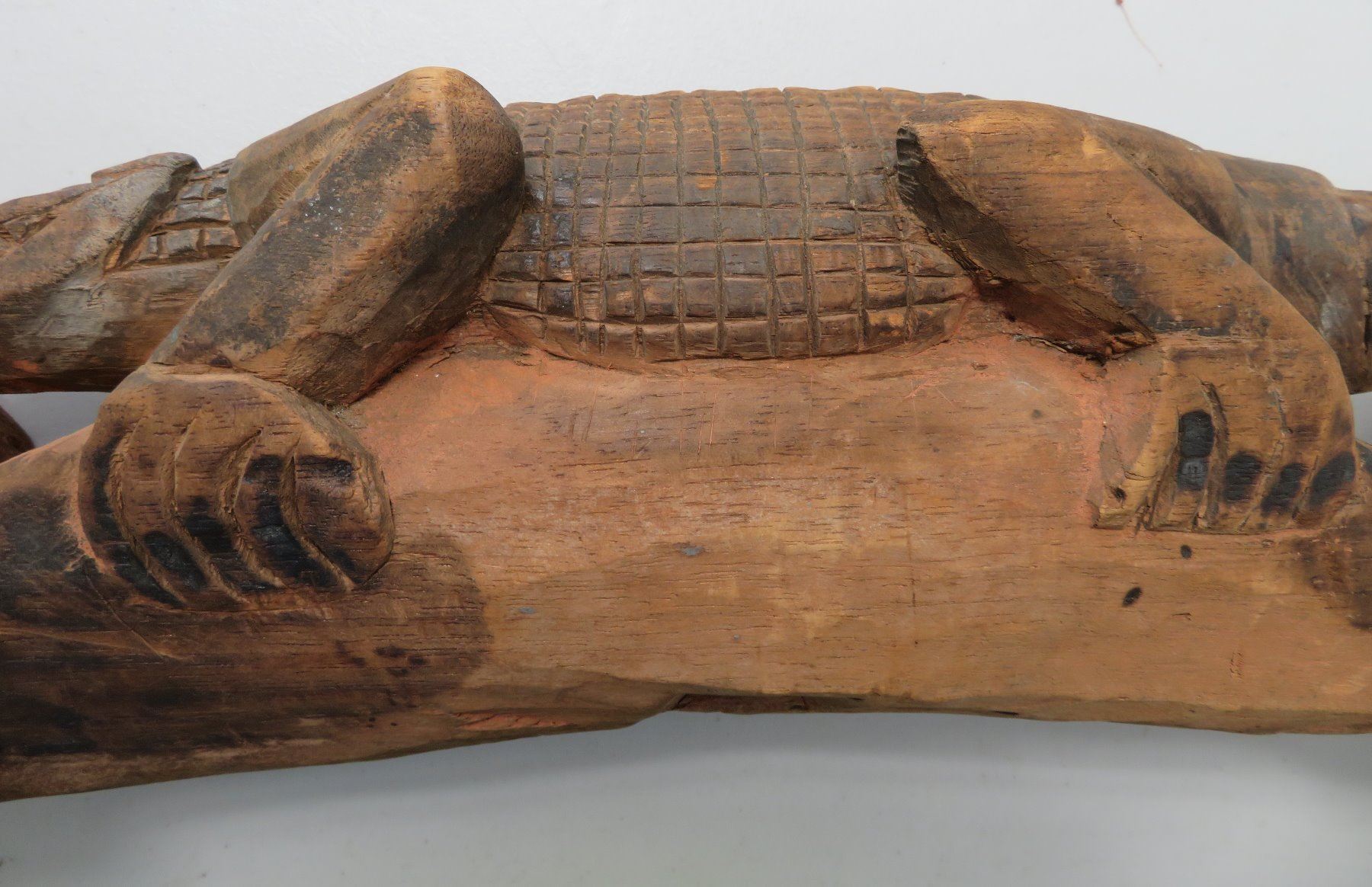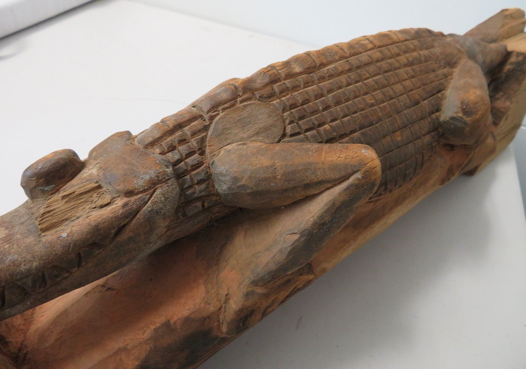 Pair of PNG Alligator Figures, c. 1940s. Made of wood, the items measure approx. 26" x 9" x 7" each. Papua New Guinea. Matched pair of carvings. Condition: As found, see images. Shipping: $65.00 USA estimate only, due to size and weight.