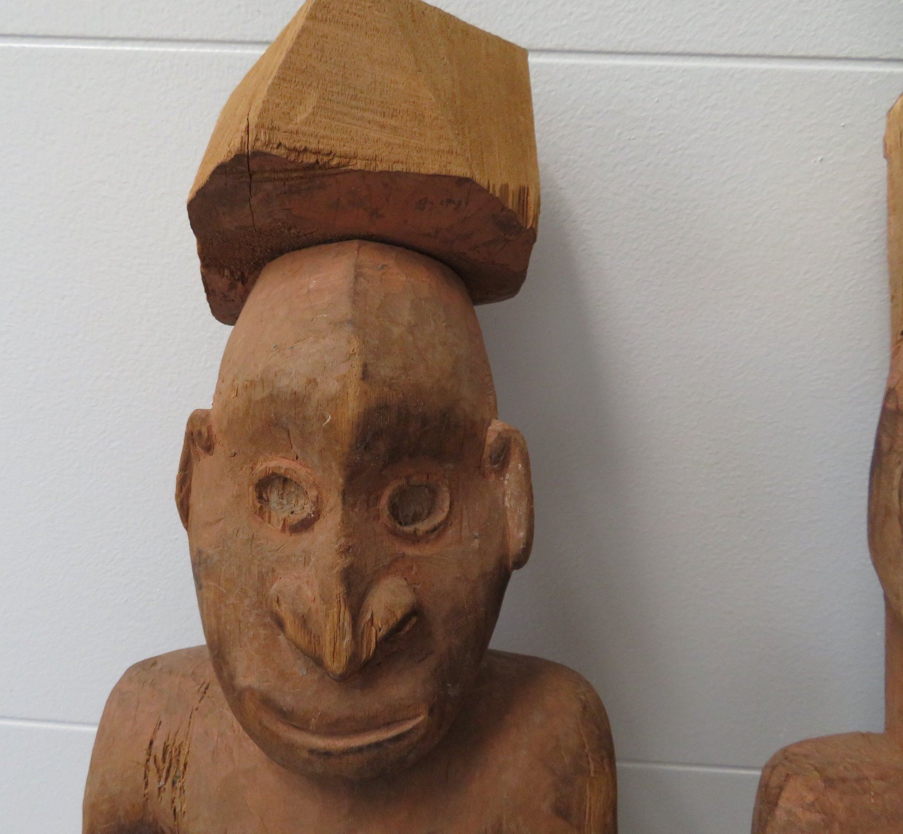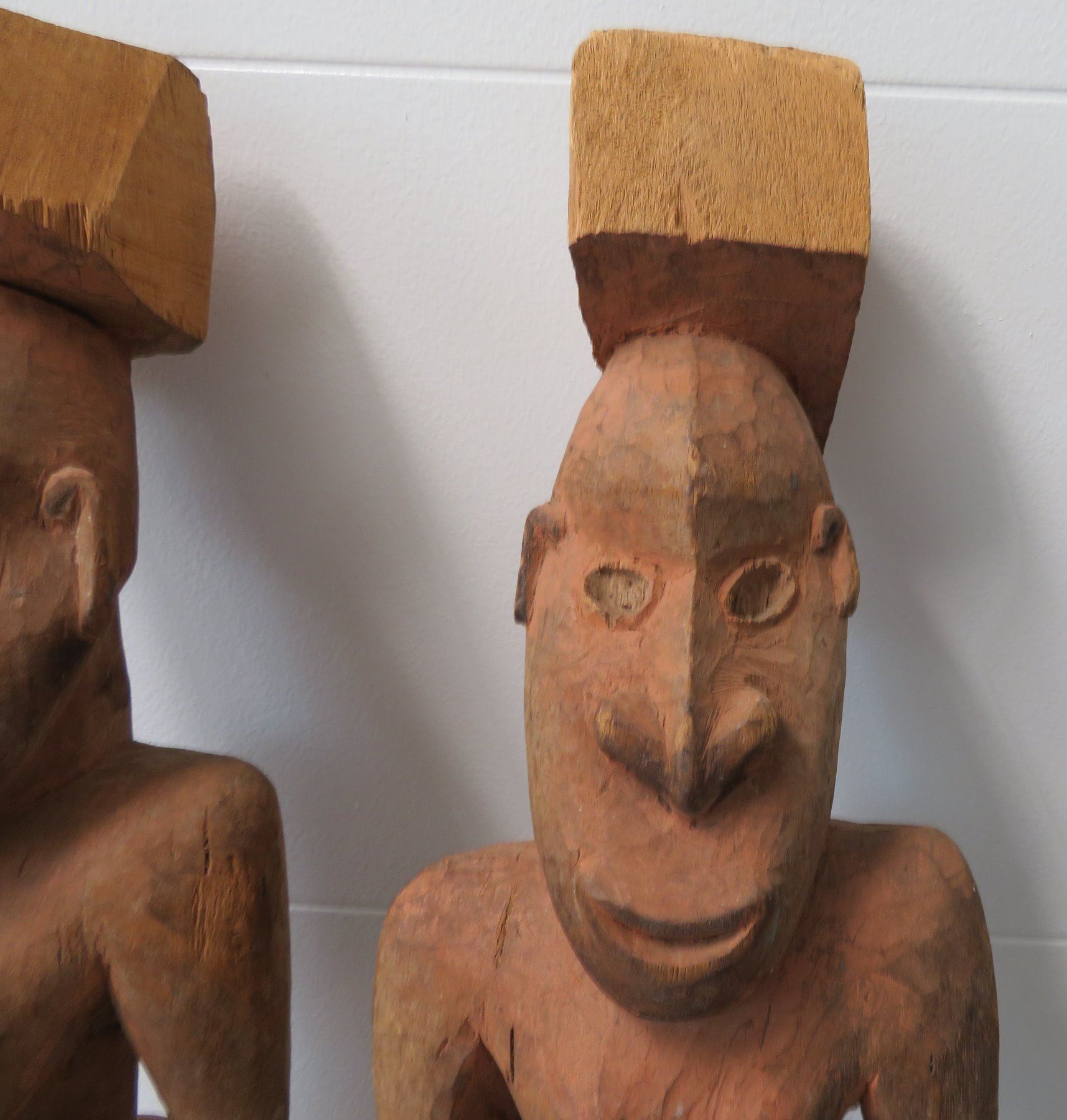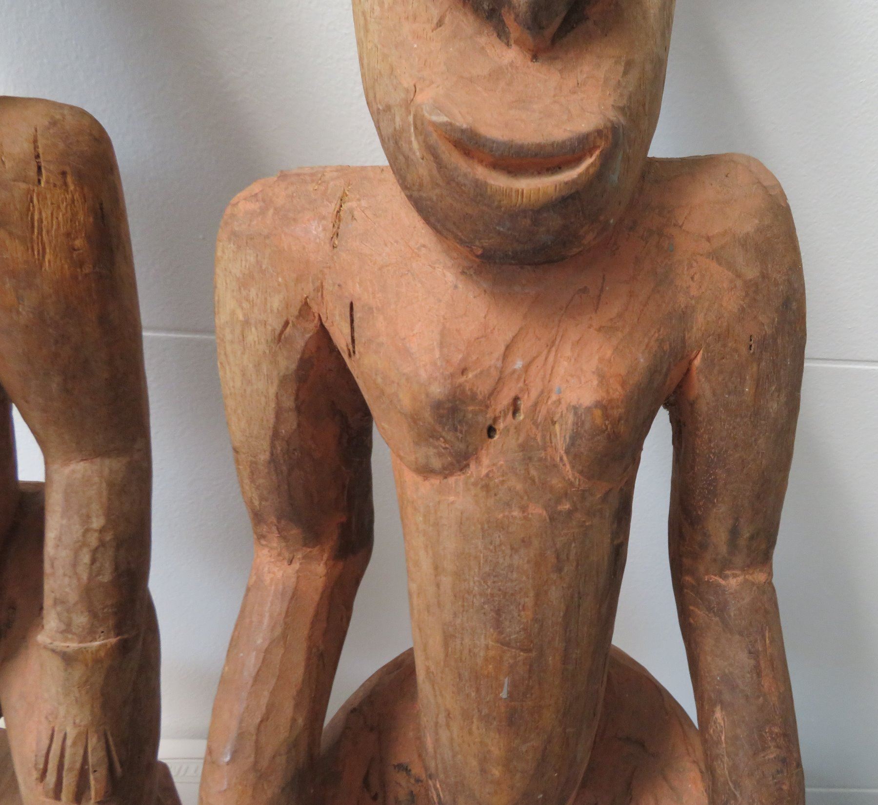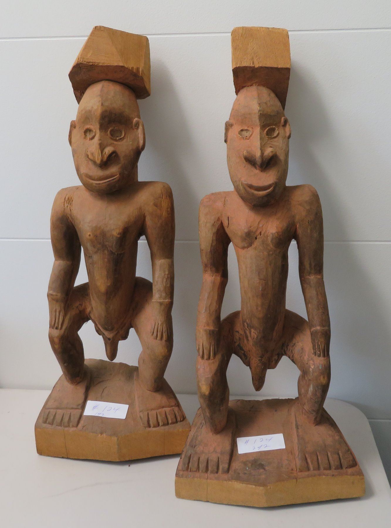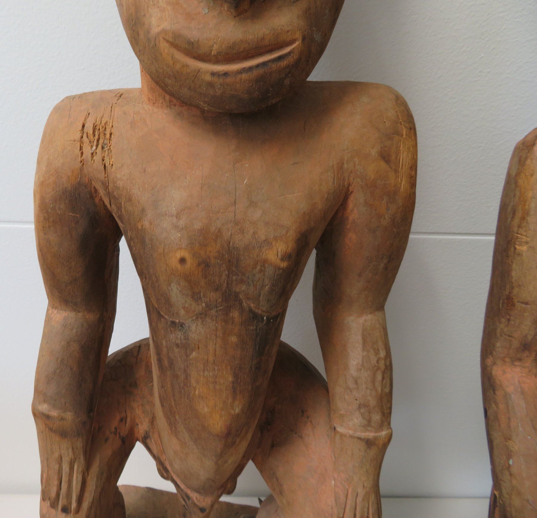 Pair of PNG Human Figures, c. 1940s. Made of wood, the items measure approx. 28" x 10" x 6" each. Papua New Guinea. Matched pair of carvings. Condition: Good, nick on nose, see images. Shipping: $65.00 USA estimate only, due to size and weight, w/insurance and signature.