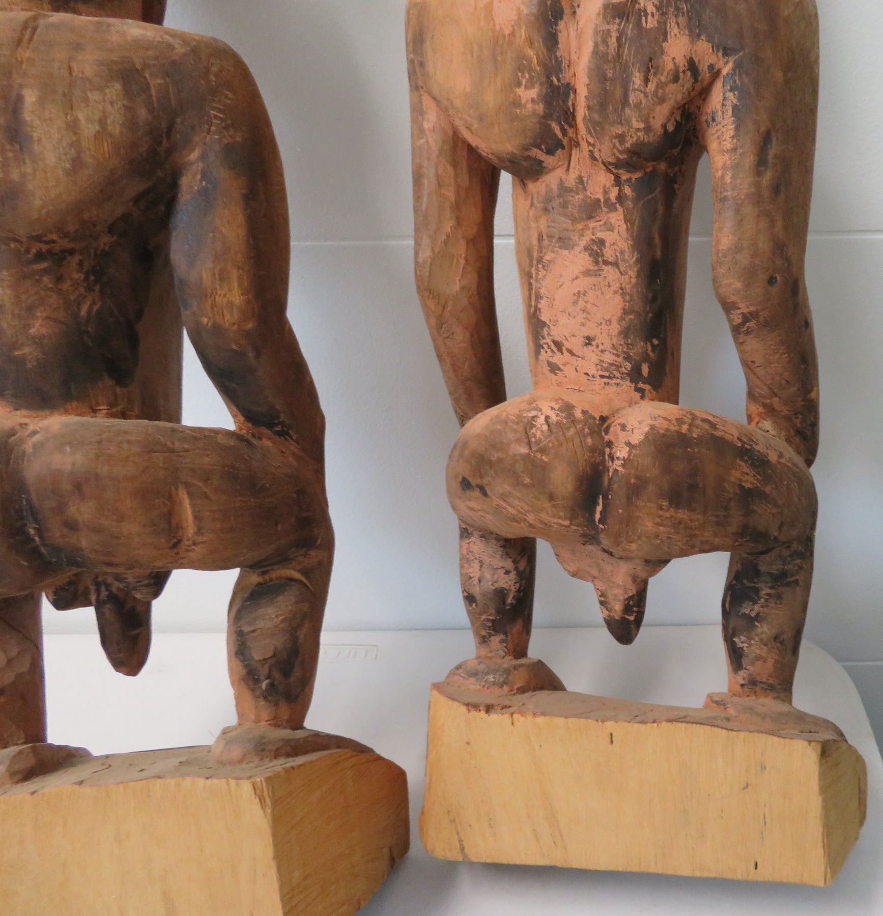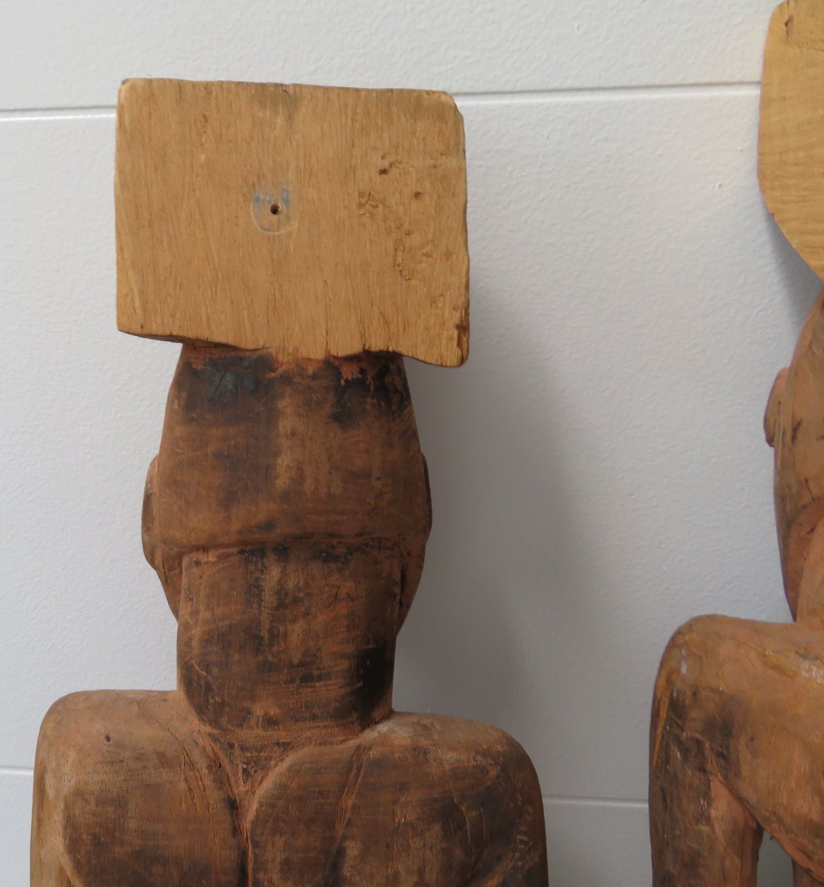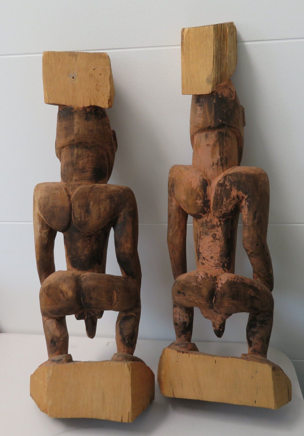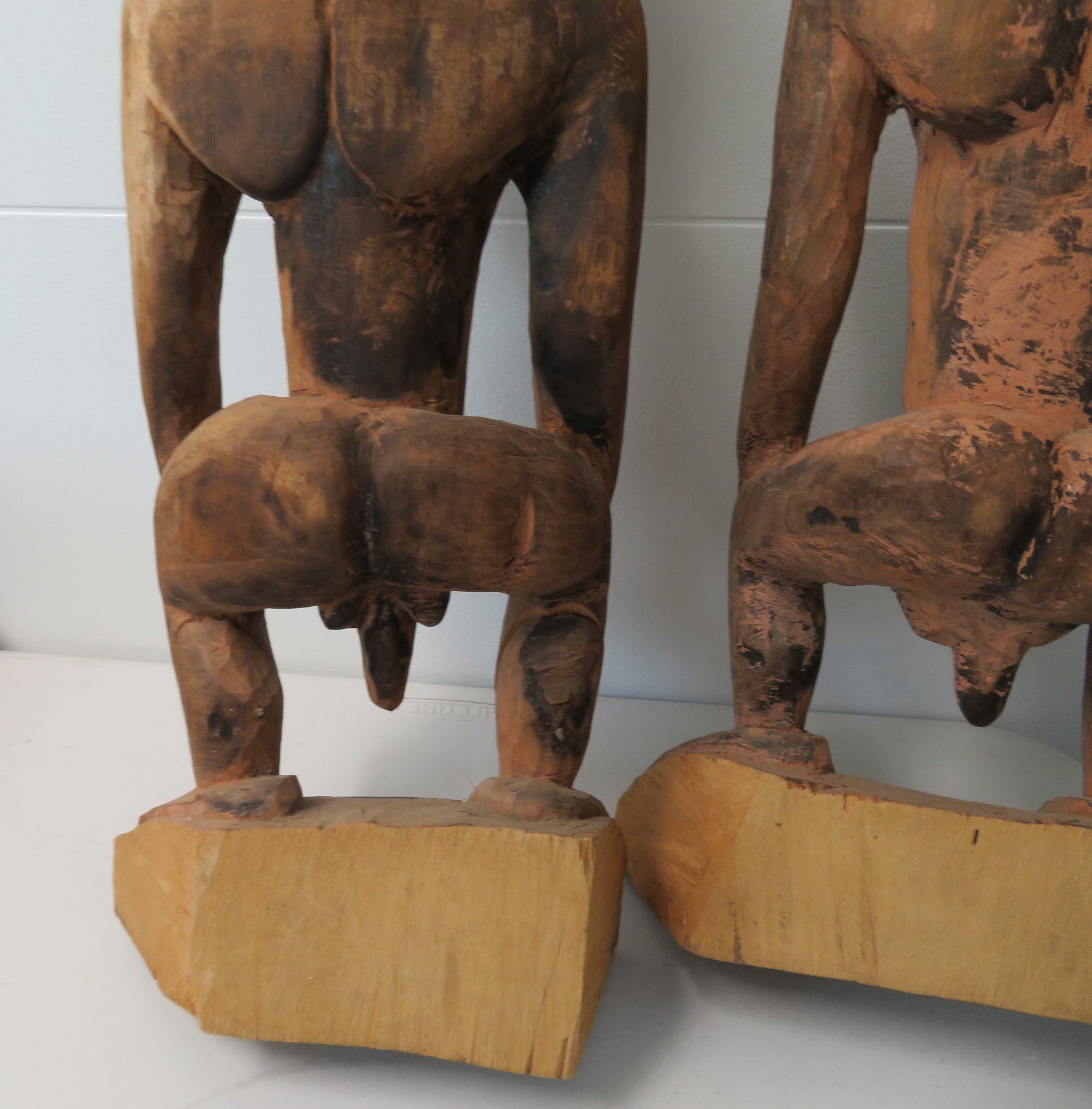 Pair of PNG Human Figures, c. 1940s. Made of wood, the items measure approx. 28" x 10" x 6" each. Papua New Guinea. Matched pair of carvings. Condition: Good, nick on nose, see images. Shipping: $65.00 USA estimate only, due to size and weight, w/insurance and signature.