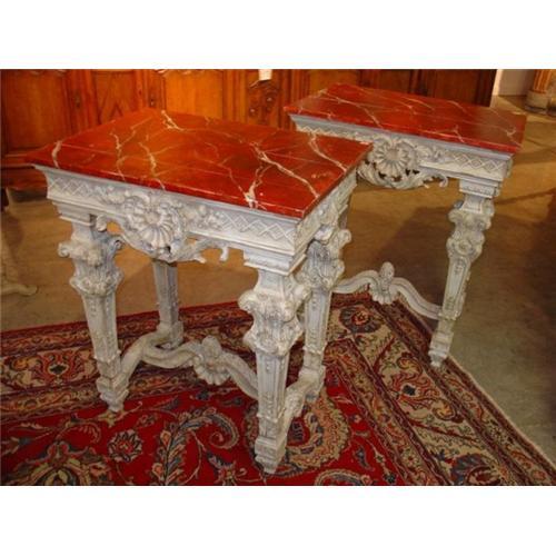 This size of consoles is quite rare and hard to find. They are painted a grayish cream with minor hints of gilding showing through. The designs are deeply carved and taken from 1600's design. As stated earlier, the tops are newly painted faux marble.