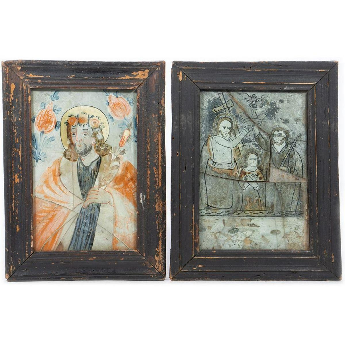 One with floral motif in blue and orange tones, the other monochromatic and mirrored/silver. Each 7 3/4in. x 5 1/4in. (glass panels); 9 13/16in. x 7 6/8in. (frames). Condition: The painted glass panels both show age and are broken into several pieces; one is more fragmented and appears to have a replacement piece. Wear to paint.