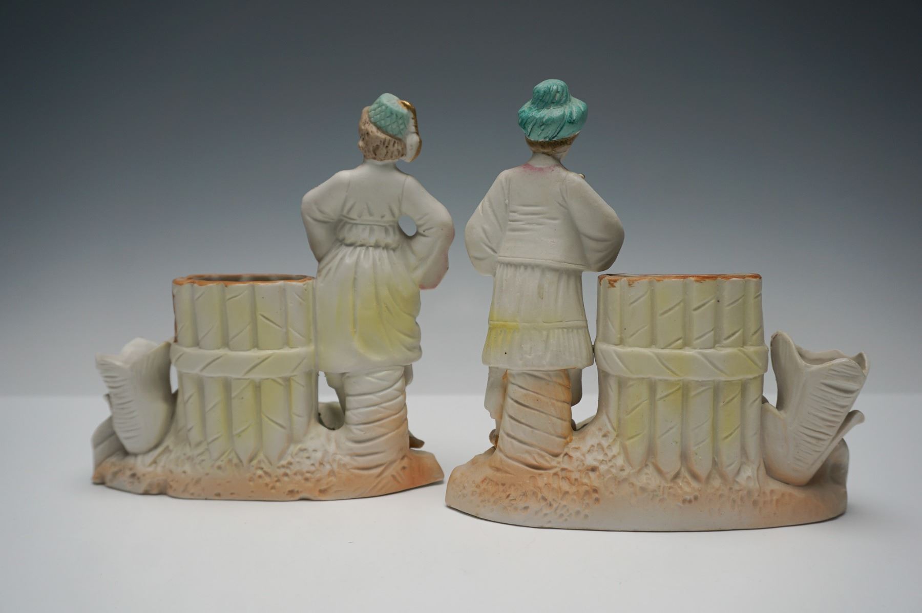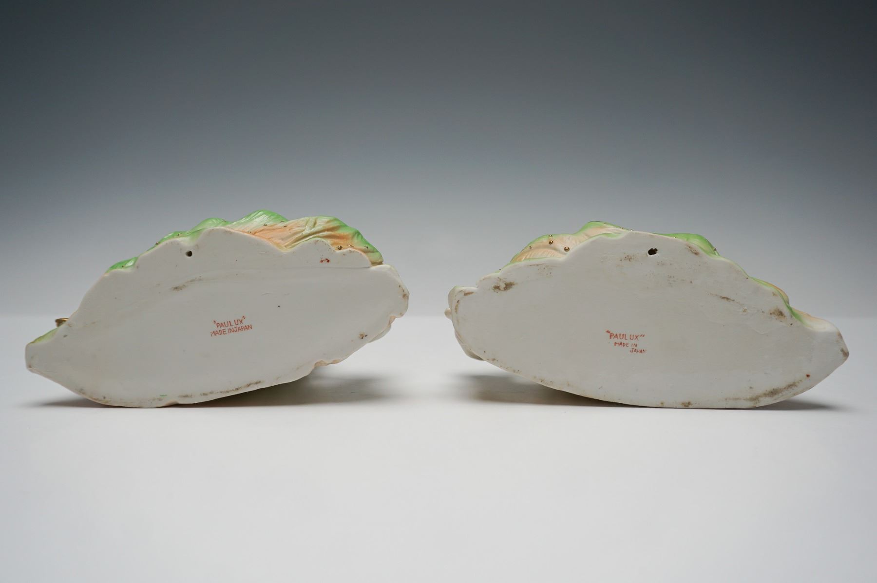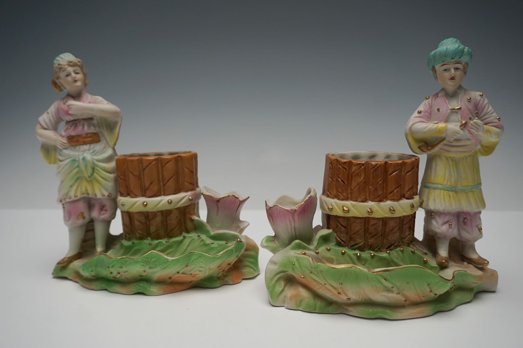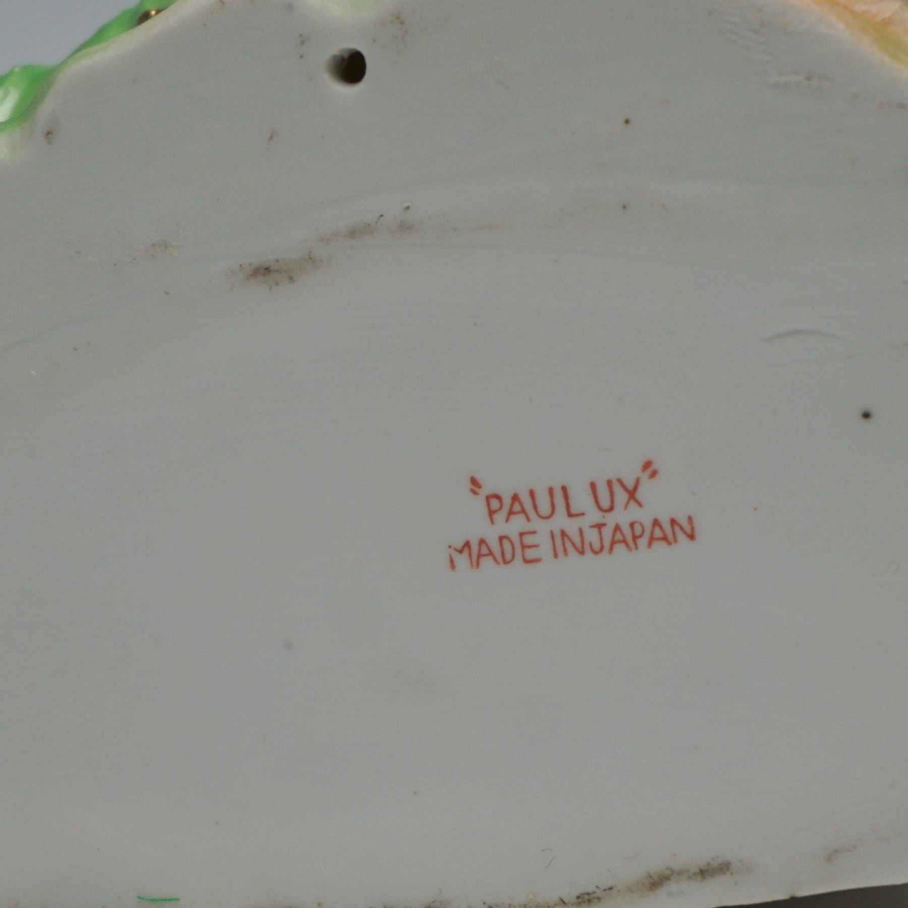 Charming pair of hand-painted porcelain figural planters by Paulux, Japan, featuring a beautifully detailed boy and girl in traditional attire standing beside textured barrel-shaped planters. Each piece is accented with pastel colors, gilded details, and floral motifs, adding to their vintage charm. Marked "Paulux Made in Japan" on the underside, these decorative planters make a lovely addition to any porcelain collection or vintage decor display.