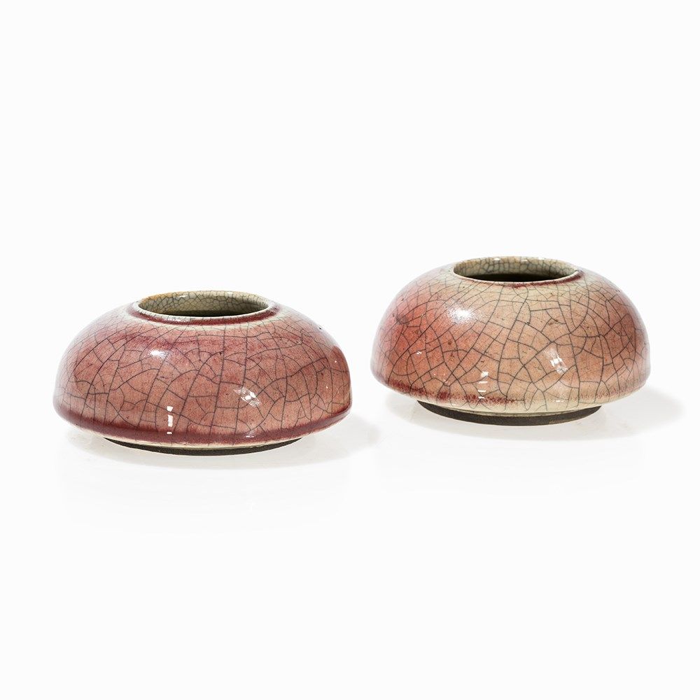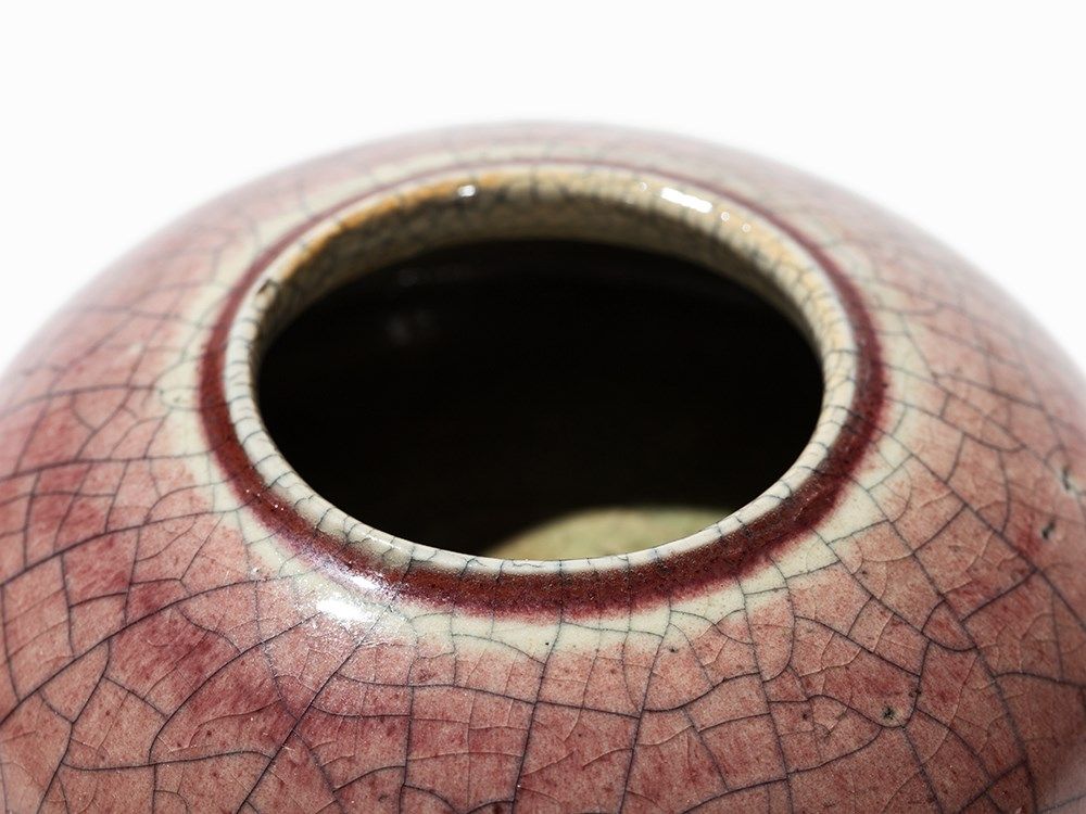 The peachbloom glaze was developed in China during the Kangxi period. It is a copper-based glaze with various nuances of a pinkish red sometimes mottled with green spots. The glaze was mainly used for objects for the scholar’s table such as small jars and brush washers. The western name of the ‘peachbloom’ glaze was inspired by the color and ripeness of the peaches. There are many shades of peachbloom, the ones with larger, undisturbed areas being the most sought-after objects among collectors.