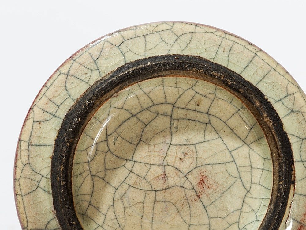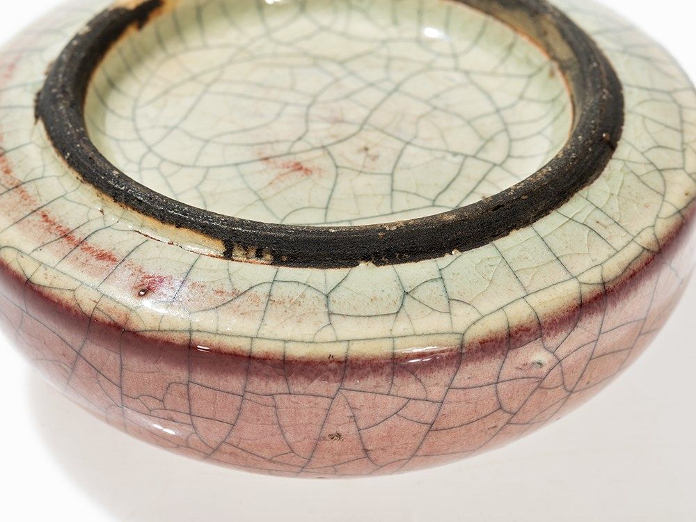 Ceramic with red peachbloom glaze on a cream background and with strong craquelé