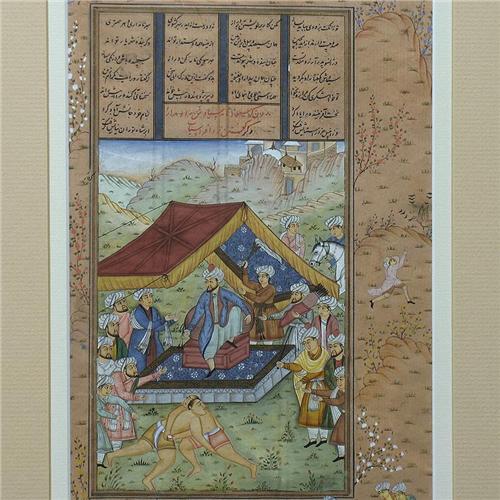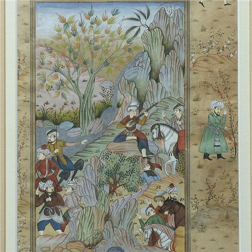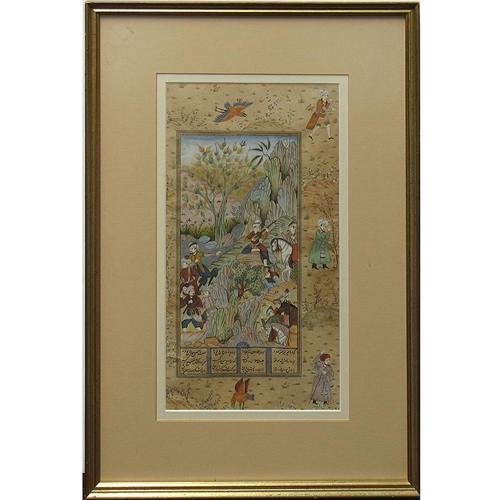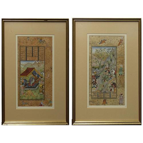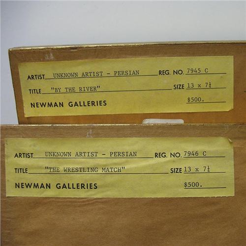 Pair of Persian miniature watercolor paintings "By the River" and "Wrestling Match"; attributed to the medieval period; signed; framed; Newman Galleries label on reverse; 13 1/4" x 6 3/4"; no visible defects