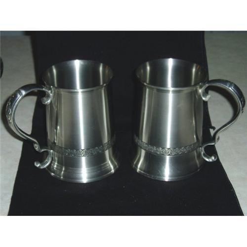 A Pair of Pewter Steins with Ornate Scroll Handle NEW These beautiful steins stands 4 3/8 in. tall and the base is 3 3/4 in. wide. Each has a row of enbellishment near the base and a beautiful ornate scroll handle. The bottom is stamped Kings Pewter Taiwan 97 1/4. Excellent condition.