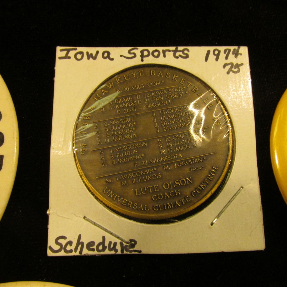 Pair of Pinbacks "Ogden Food Service 646" & "Ogden Food Service Corp. 170"; pinback "Junior Olympics XIX August 1985 Iowa City, Ia."; & "74 75 Iowa Hawkeyes Basketball" Schedule coin, 39mm, Brass.