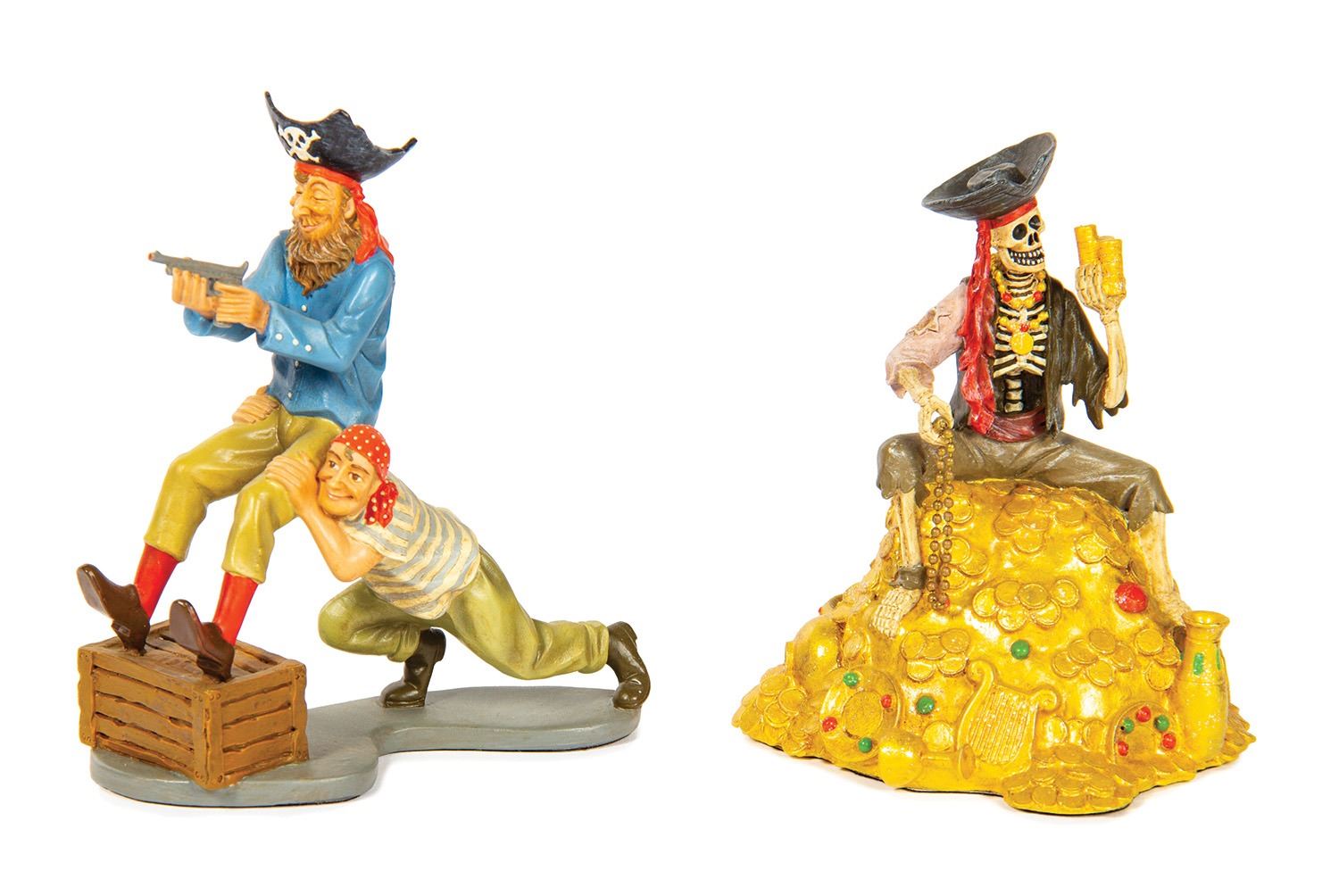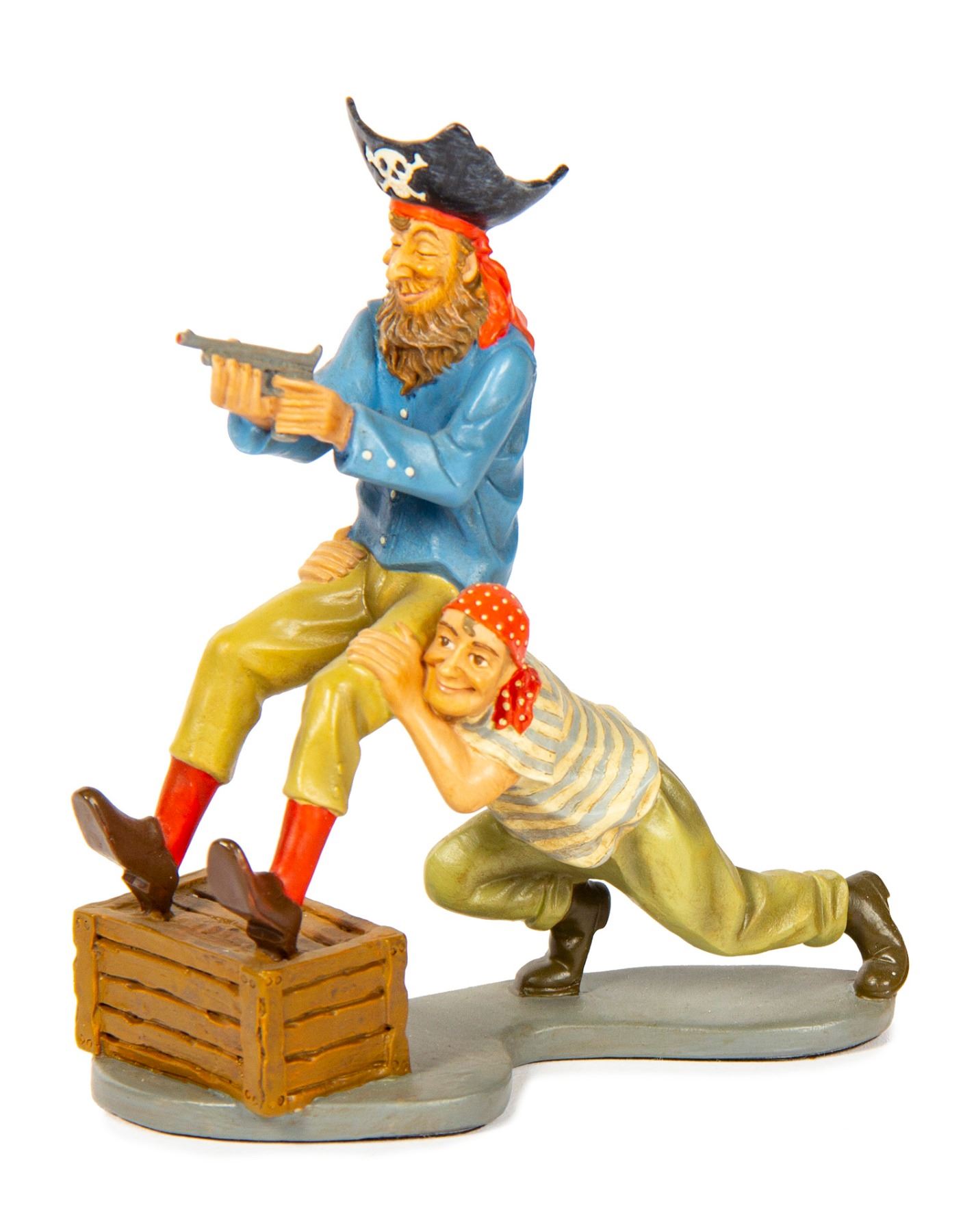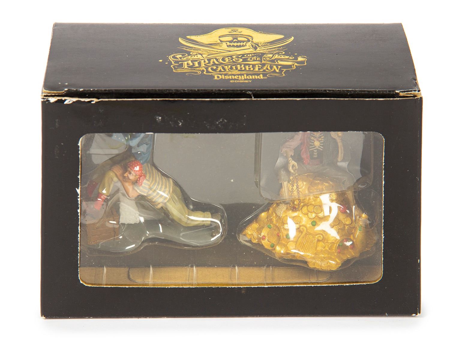 (Disneyland, c.2000s) A pair of limited edition Pirates of the Caribbean figures based on the popular characters seen throughout the attraction. The pair includes the skeleton on a mound of treasure as well as a figure of a pair of pirates. The figures measure between 3.5" and 4" tall and are in very good condition with minor wear to the original windowed box.