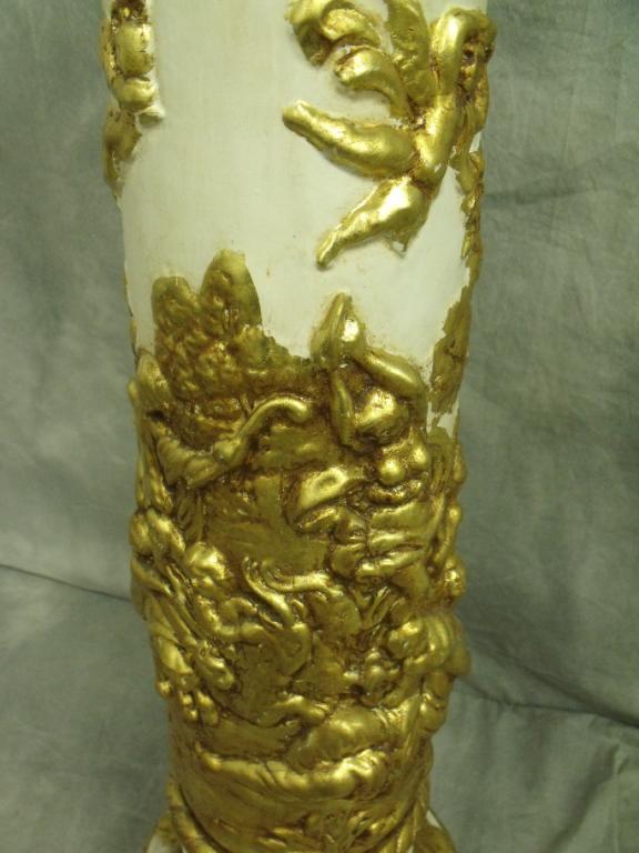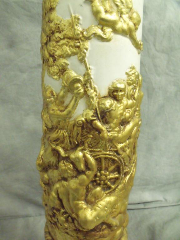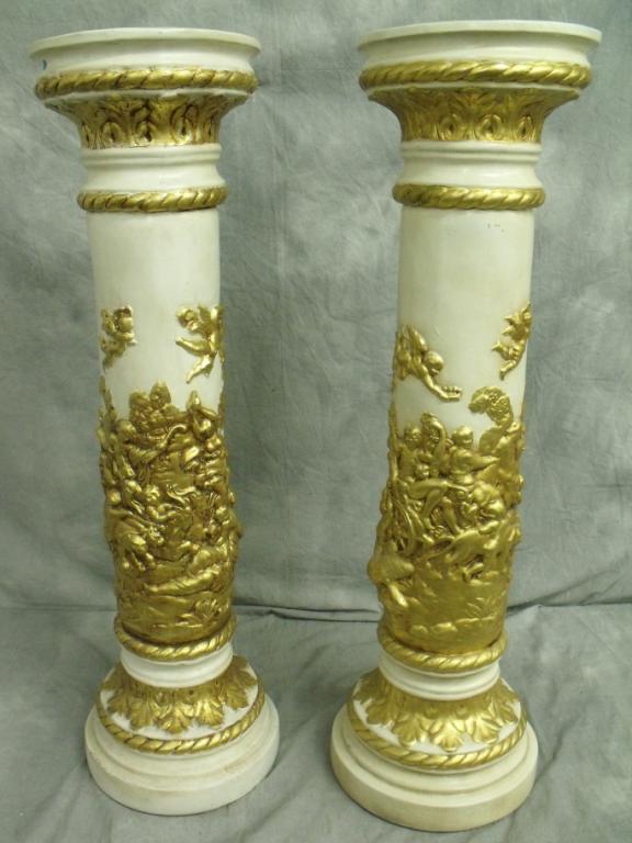 Pair of Renissance style gilt plastered glory columns. Tapering columns finished in white with gilt profile, depicting nude figures at celebration 46" tall in good condition.