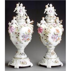 Pair of Plaue Porcelain Floral Encrusted and Covered Potpourri Urns on Stands