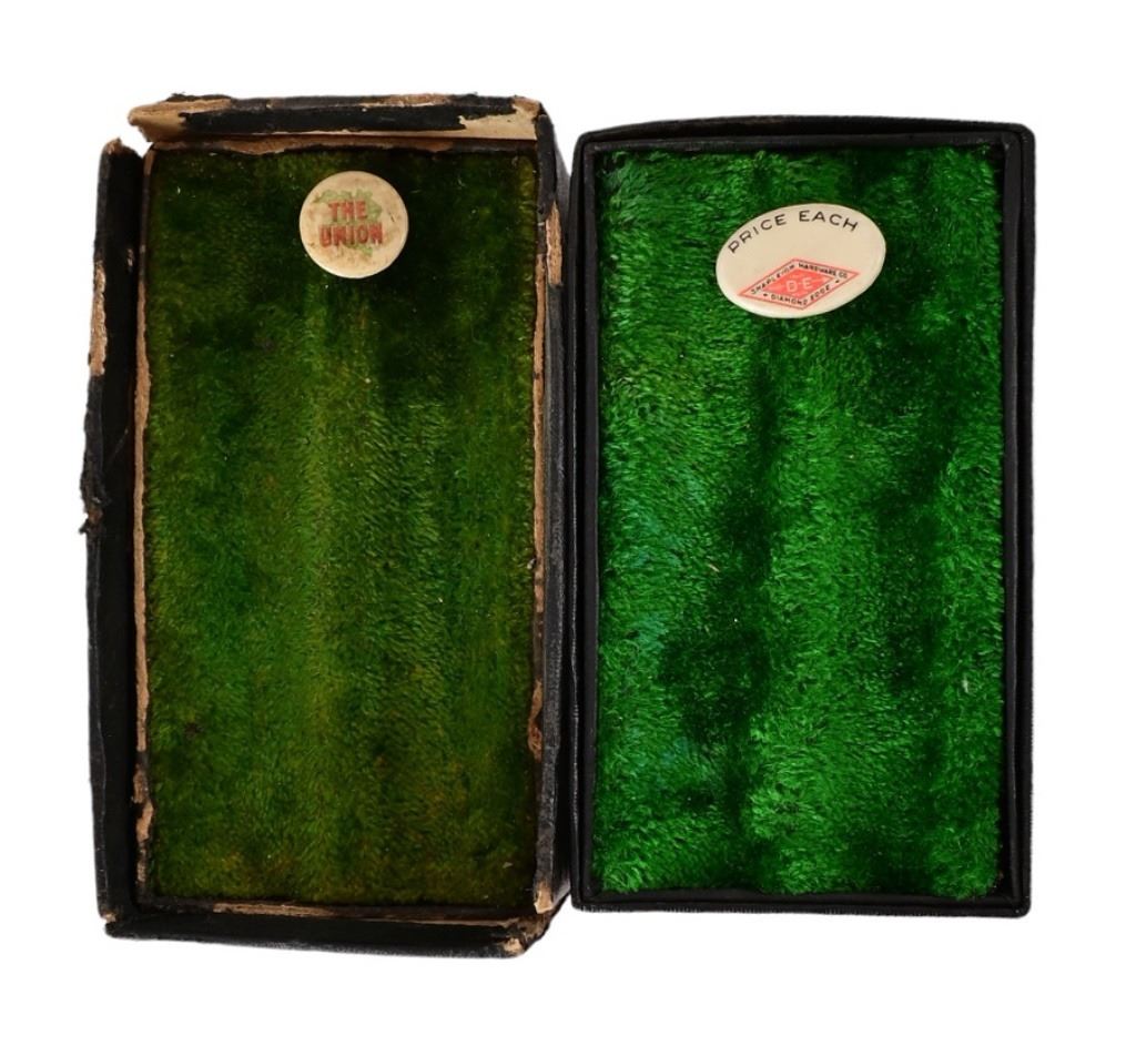 Empty pocket knife display boxes.4 1/4" X 2 3/4" X 2 3/4" and 4 1/2" X 2 1/2" X 2 3/4".