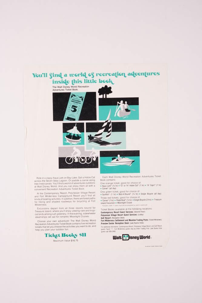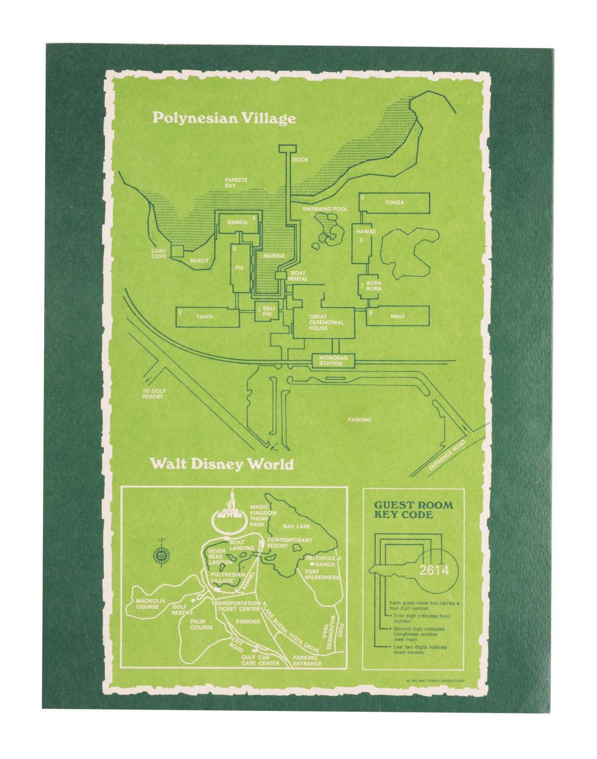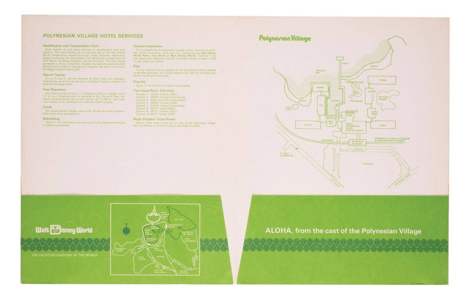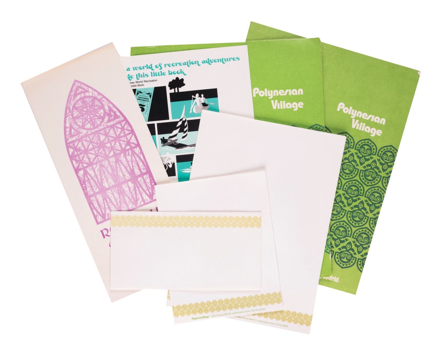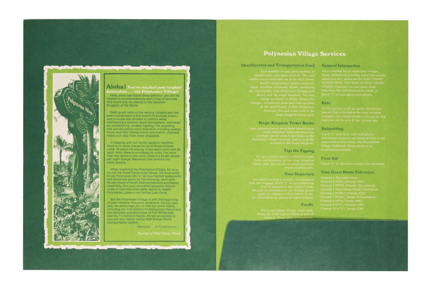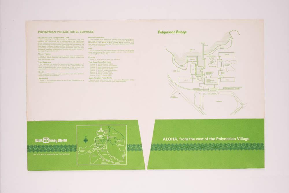 (Polynesian Resort, 1970s) A pair of Polynesian Village Guest Services folders containing vital hotel information for guests. Inside the larger of the two folders is a brochure on religious services, (2) envelopes, (2) sheets of note paper, (3) sheets of stationery, and a flyer advertising the Recreation Adventures ticket book. The folders measure 12"x9" and 11.75"x9. Both are in very good condition with some creasing at the corners and edge wear, and a few spots of discoloration on the cover of the larger folder.