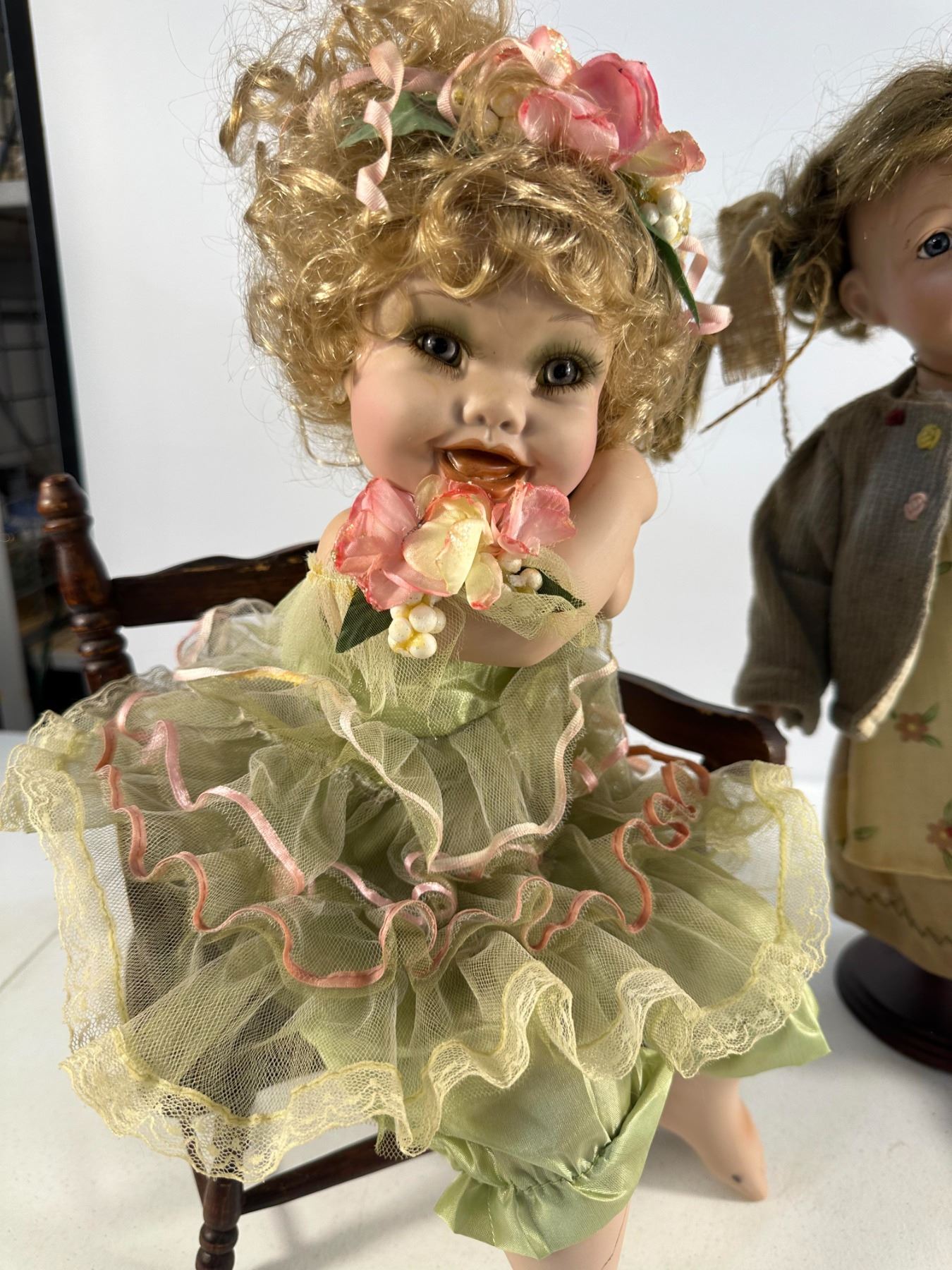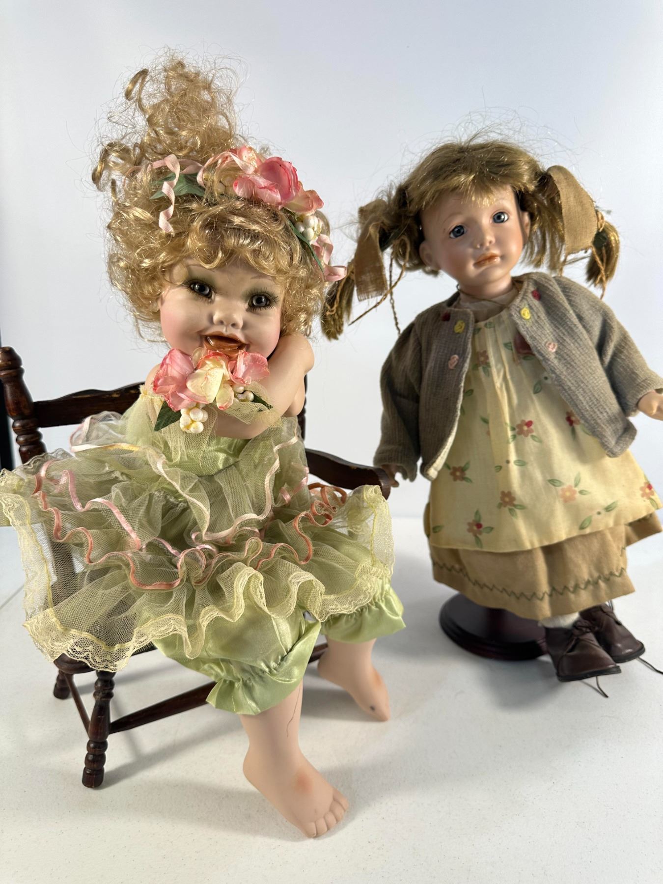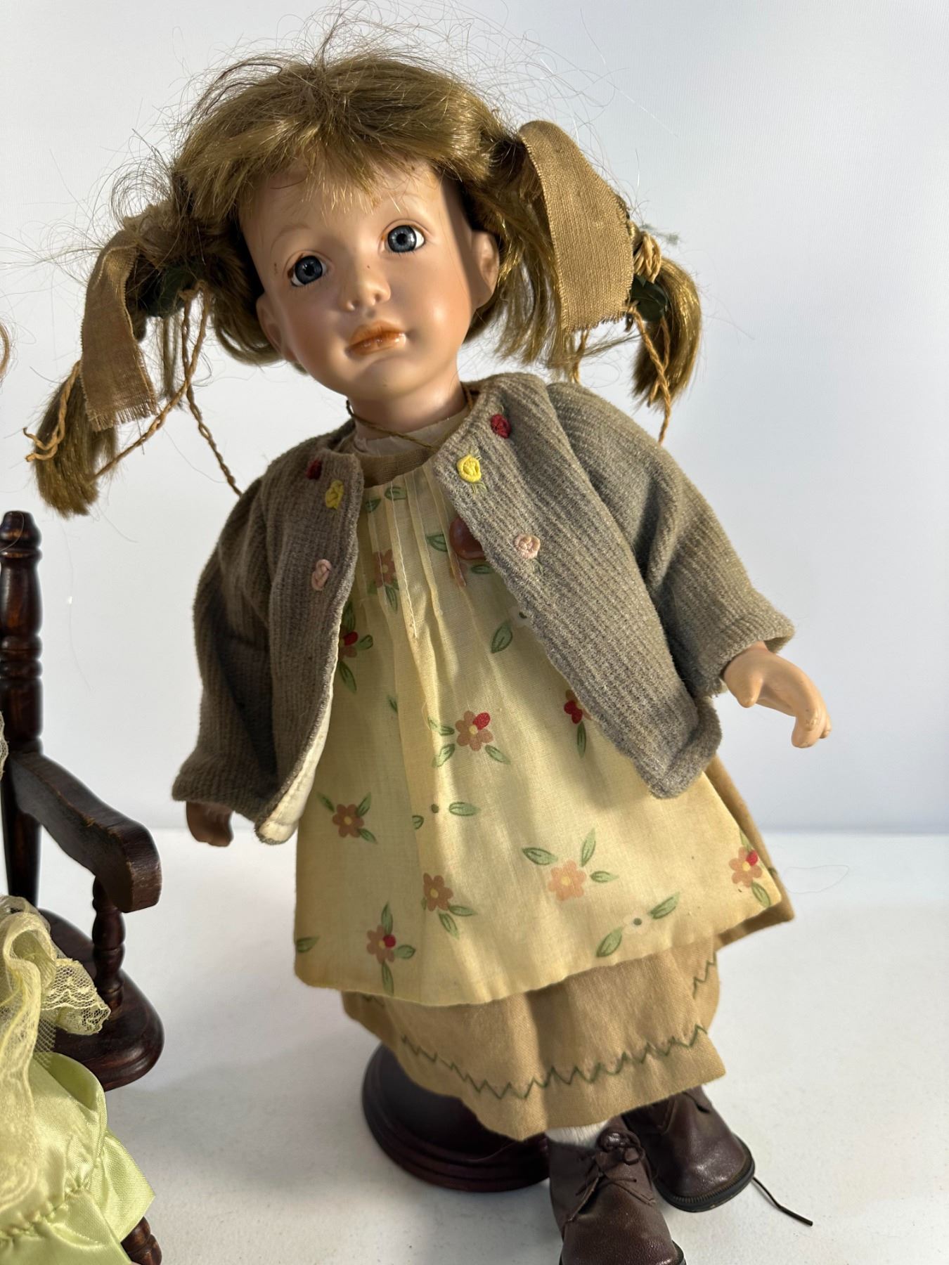 Two expressive porcelain dolls with detailed faces and charming attire. One wears a ruffled green dress with floral accents and curly hair, while the other features a floral dress with cardigan and pigtails. Includes wooden doll stand and chair. Late 20th century. Good condition overall; slight wear to hair and clothing consistent with display use.