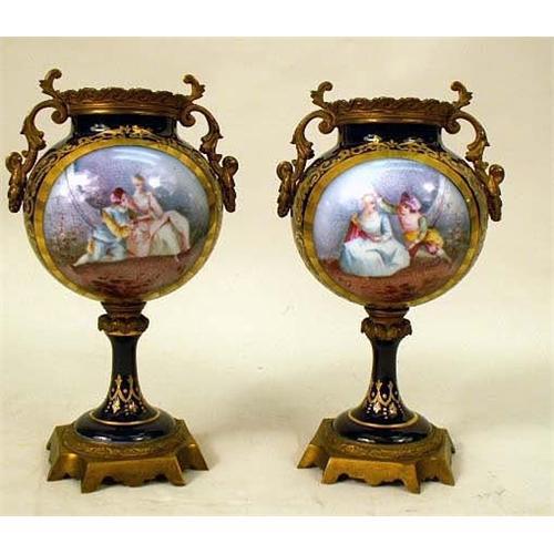 Pair of Sevres Hand Painted Ormolu Garnitures - Each Hand Painted and signed by the Artist, Pajot - Deep Cobalt Color Background. Very Good to Excellent Condition. Mid to Late 1800's. 8.5" h