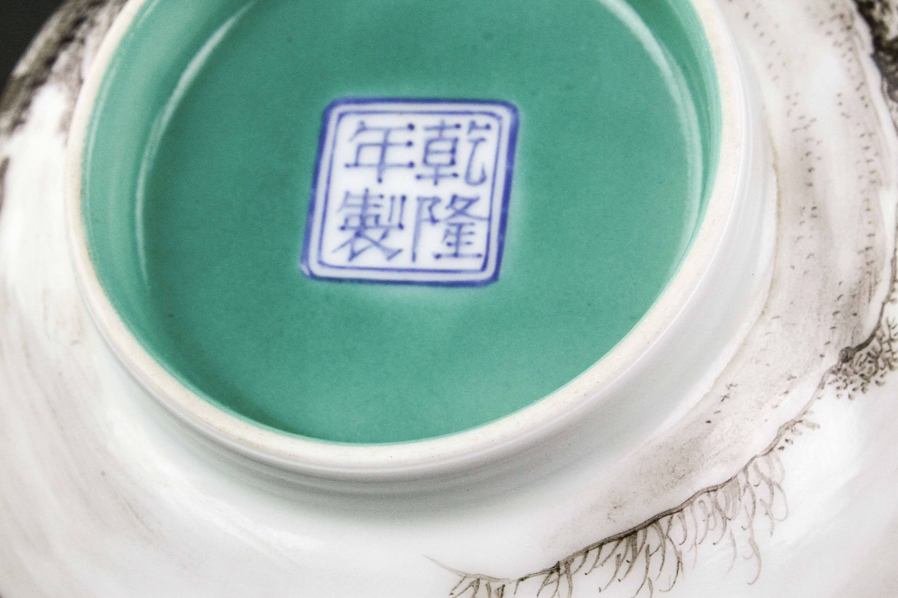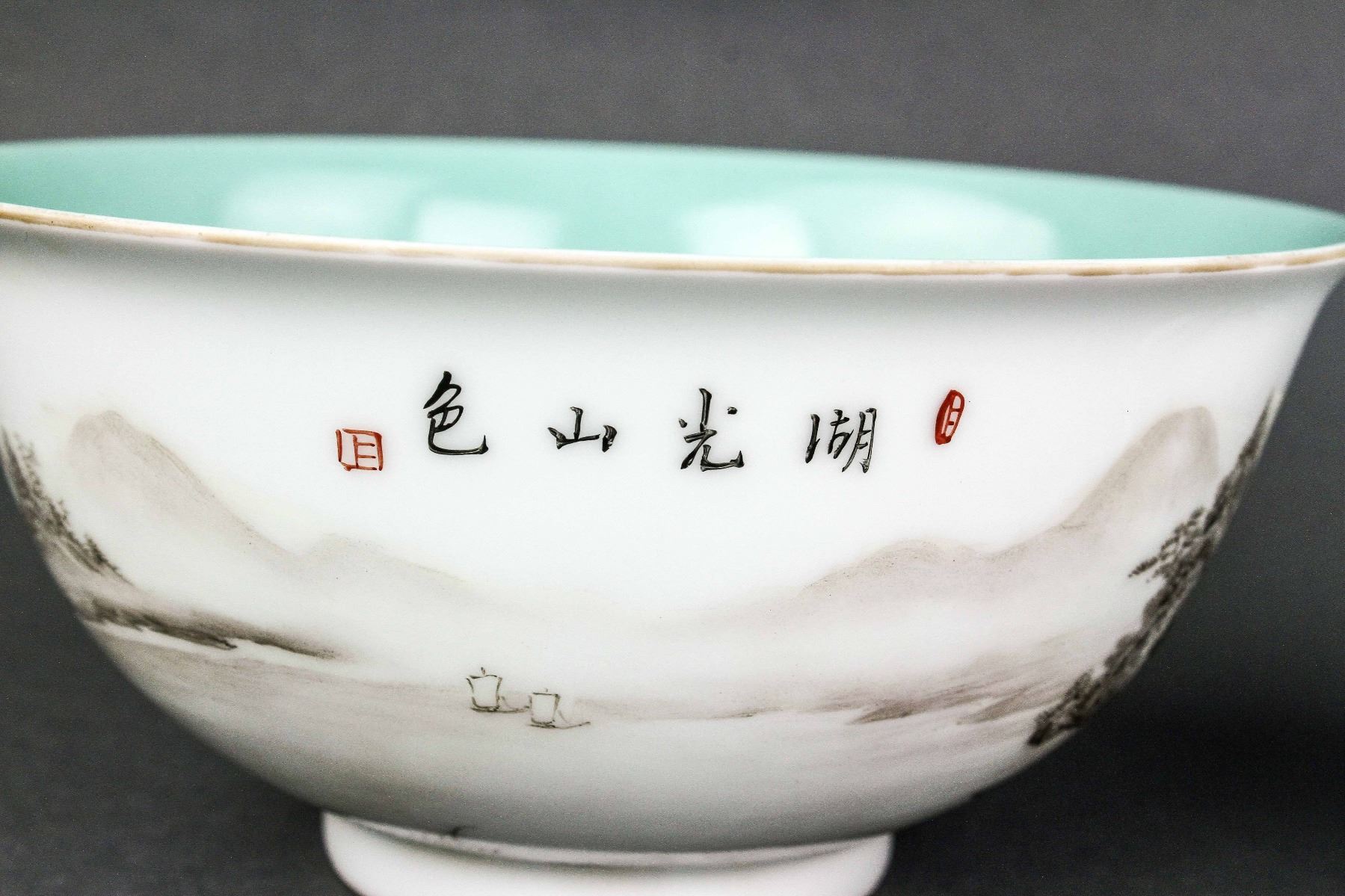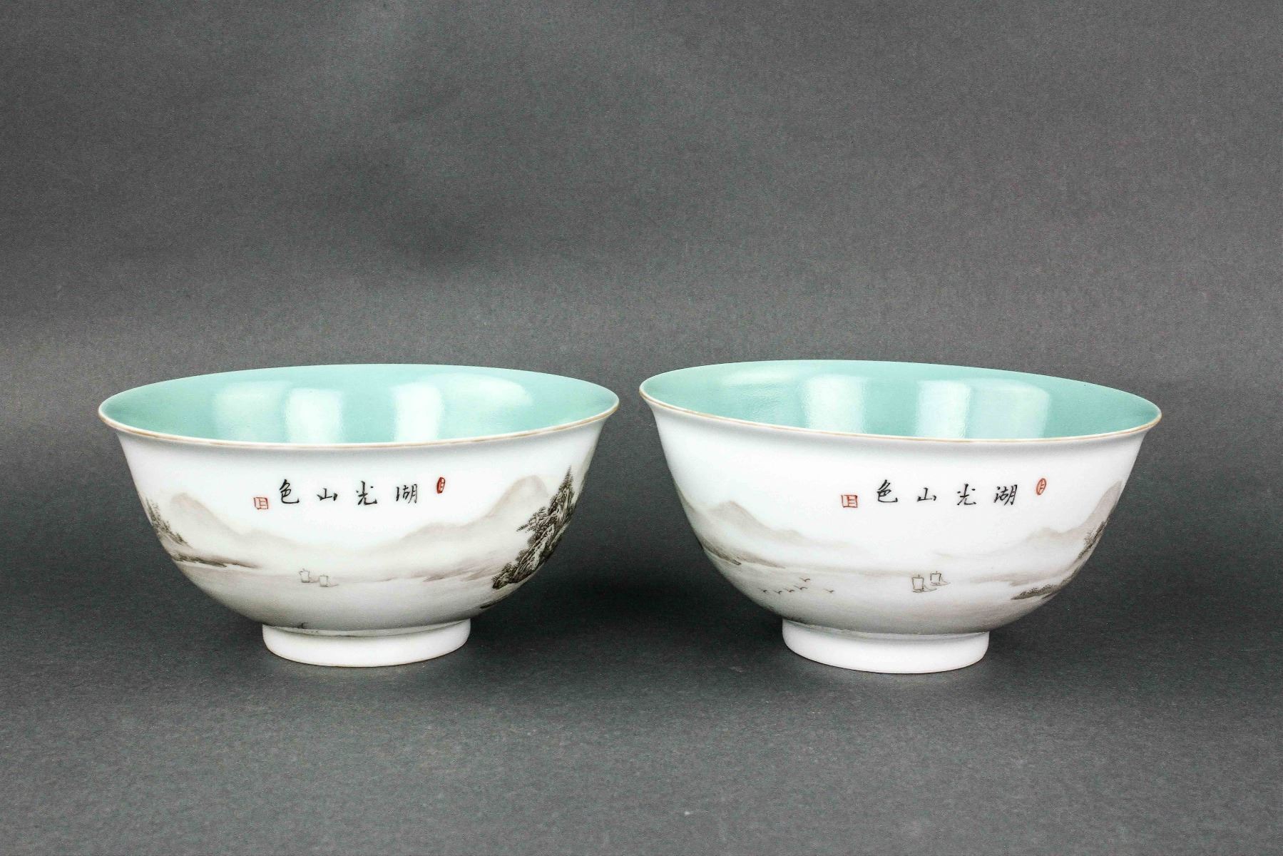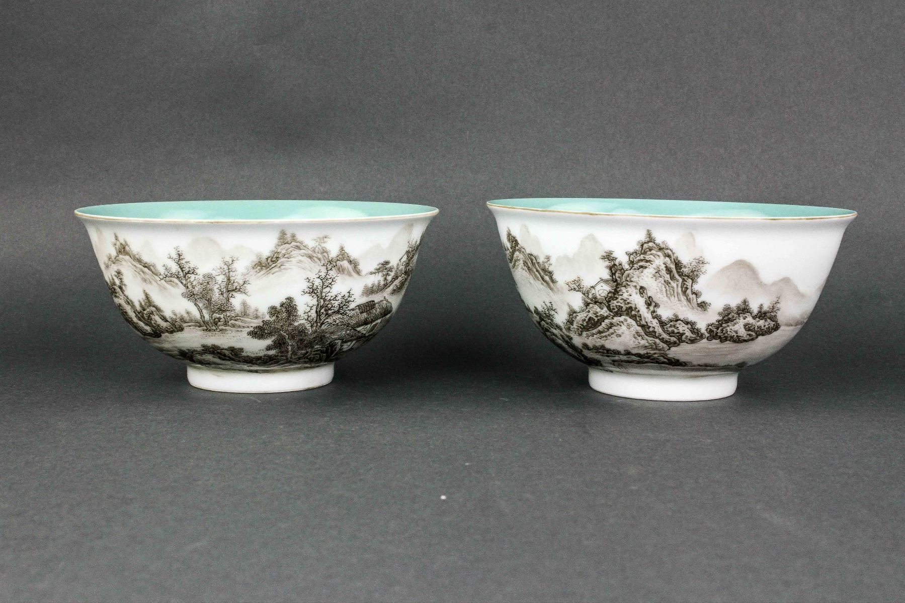 Pair of Chinese Grisaille decorated porcelain bowls; the exterior with painting of landscape; the interior with turquoise glaze; four-character Qianlong mark on base; H: 8 cm, D: 16 cm, 560 grams total
