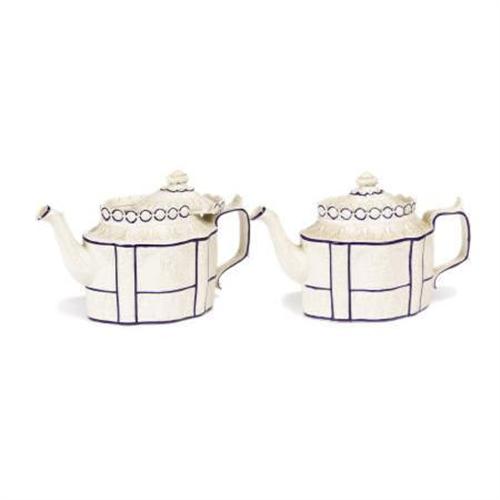 <B>Pair of Continental Porcelain Teapots<BR></B></I>Unknown maker<BR>Twentieth Century<BR>6.5 inches high x 9.5 inches wide x 4.5 inches deep<BR>Potters marks to the underside<BR><BR>The pair of bisque porcelain teapots, the angular bodies molded with classical figures, flowers, and leaves; trimmed in blue.<BR><BR><b>Shipping:</b> Requires 3rd Party Shipping (<a target="_blank" href="http://www.heritageauctions.com/common/shipping.php">view shipping information</a>)