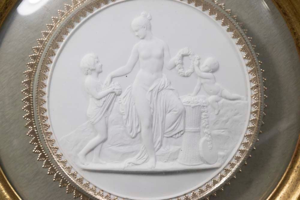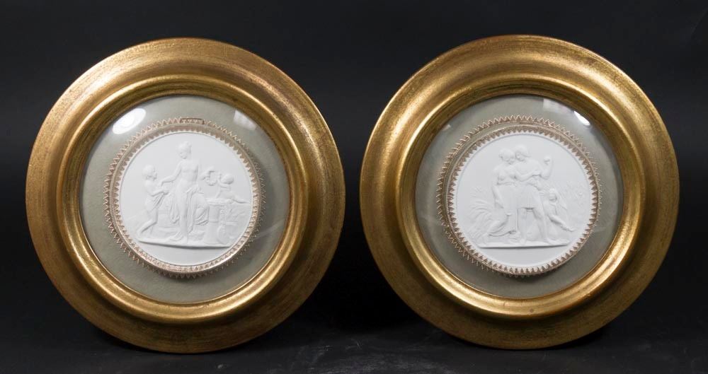 Pair of framed round classical scene plaques, possible Royal Copenhagen. Plaques - approx. 5 1/4" in diameter, with frames - 11 3/4" in diameter. Excellent condition.