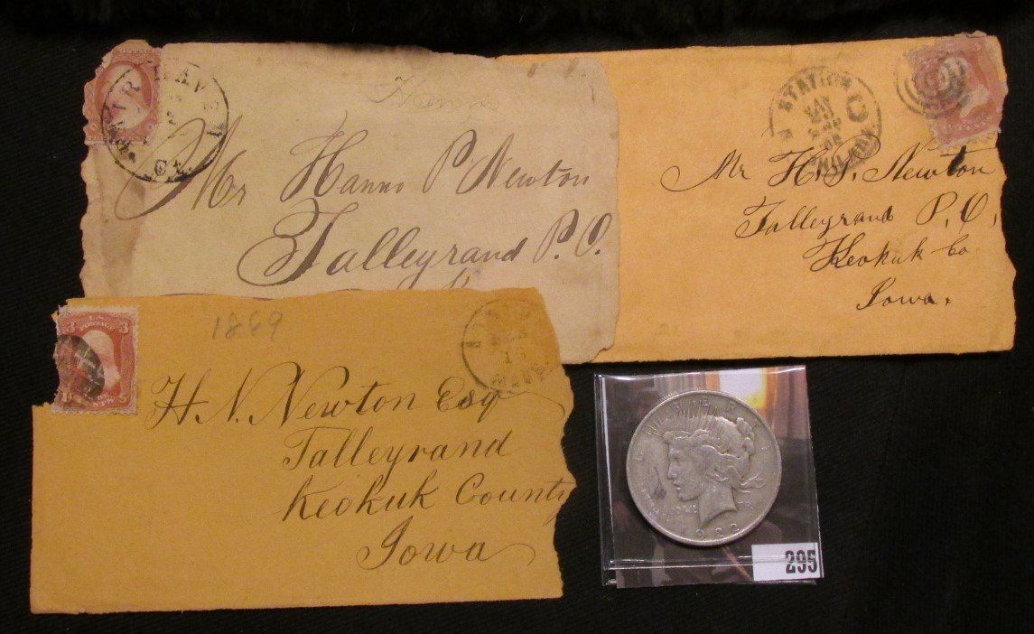 Pair of Post Civil War Covers, both addressed to the dead Post Office in Talleyrand, Keokuk County, Iowa, one with a Bullseye Cancel, the other with a Cork Cancel; & 1922 P U.S. Peace Silver Dollar, Fine.