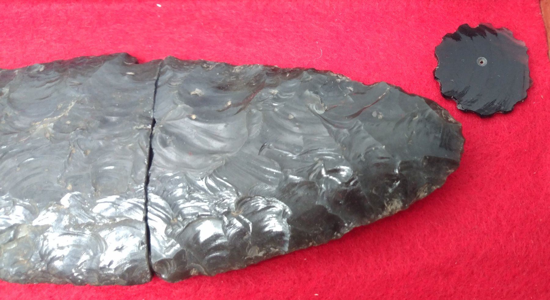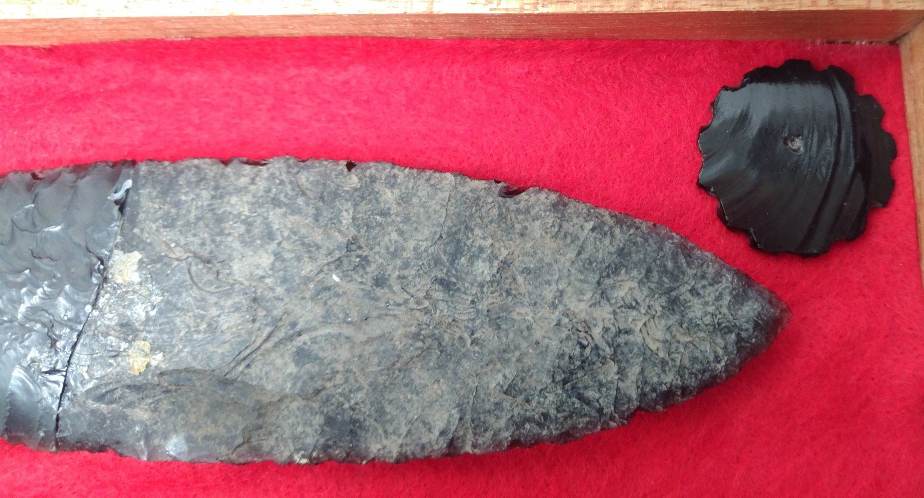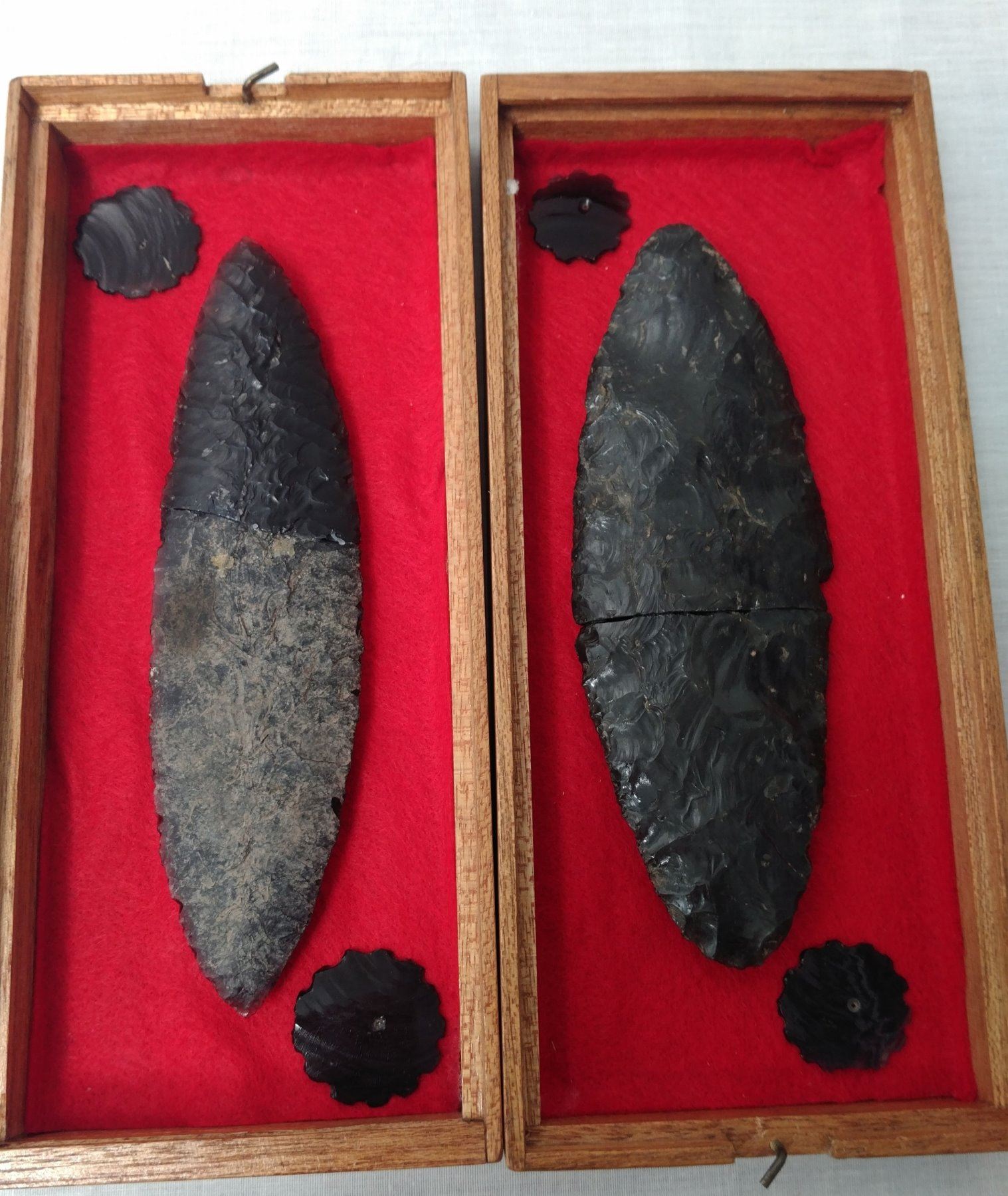 Pair of Pre-Columbian Blades, pre-Columbian items. Made of obsidian, each blade is approx. 7" long. Colima, Mexico. Also 4 obsidian discs, 1" wide x 1/16" thick. Frames included. Condition: Both found in two pieces and glued, see images. Shipping: $24.50 w/insurance and signature.