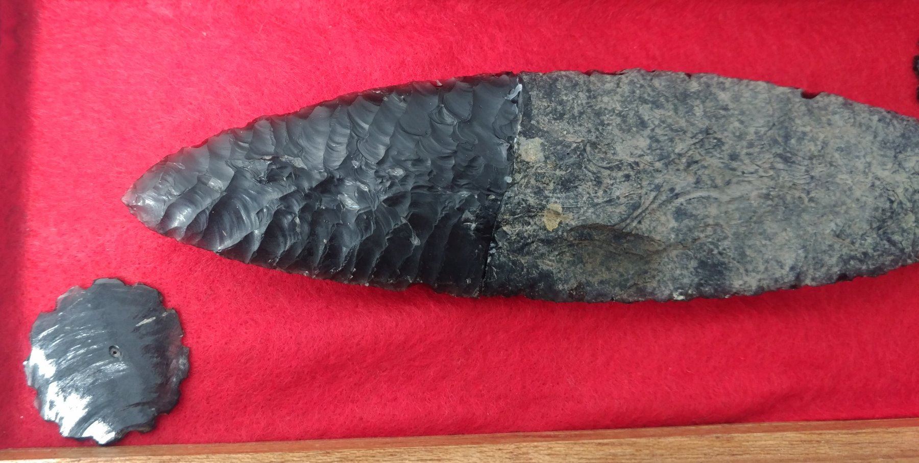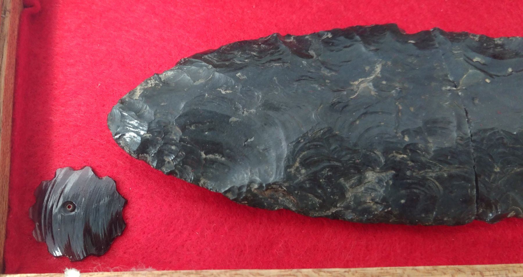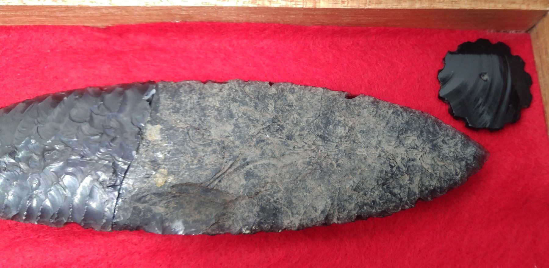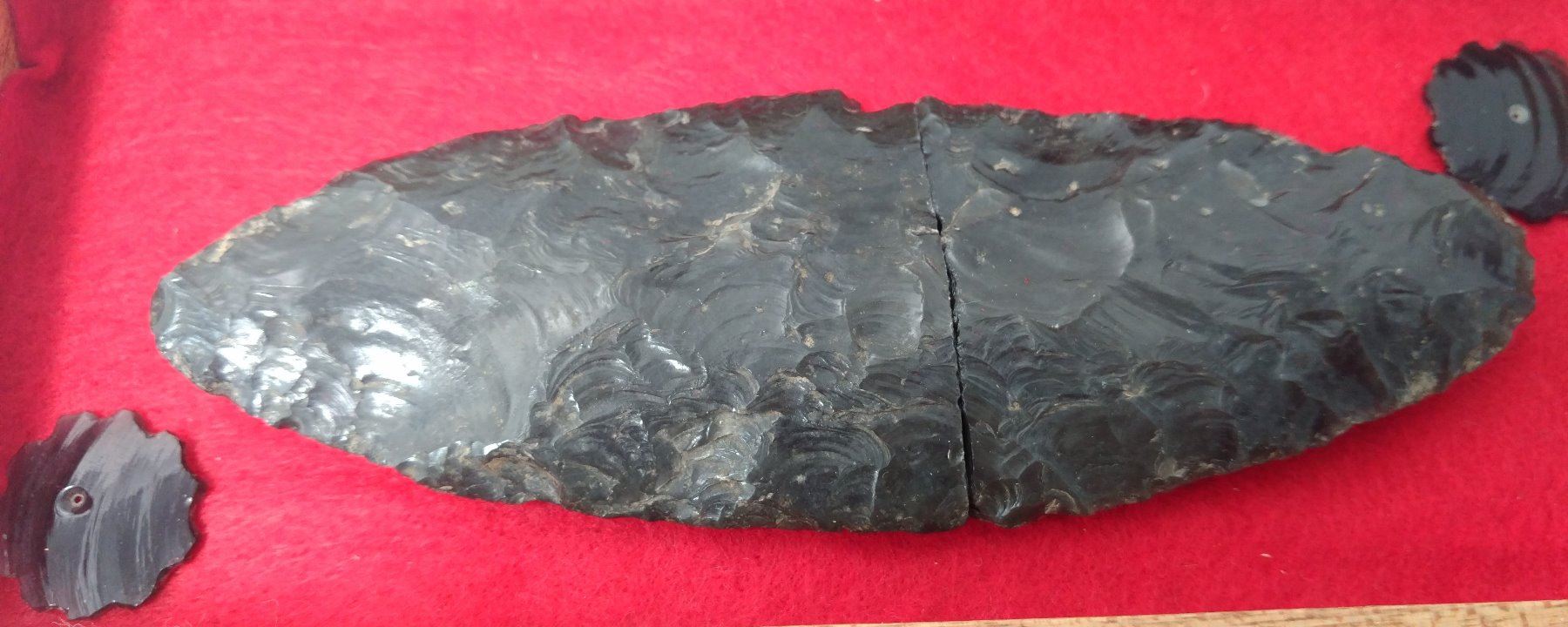 Pair of Pre-Columbian Blades, pre-Columbian items. Made of obsidian, each blade is approx. 7" long. Colima, Mexico. Also 4 obsidian discs, 1" wide x 1/16" thick. Frames included. Condition: Both found in two pieces and glued, see images. Shipping: $24.50 w/insurance and signature.