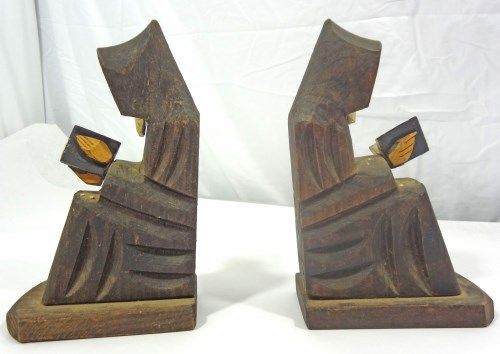Mexican Folk Art, made of carved wood. These could be used as bookends. Measures 8" tall. Est Value $25.00-45.00.