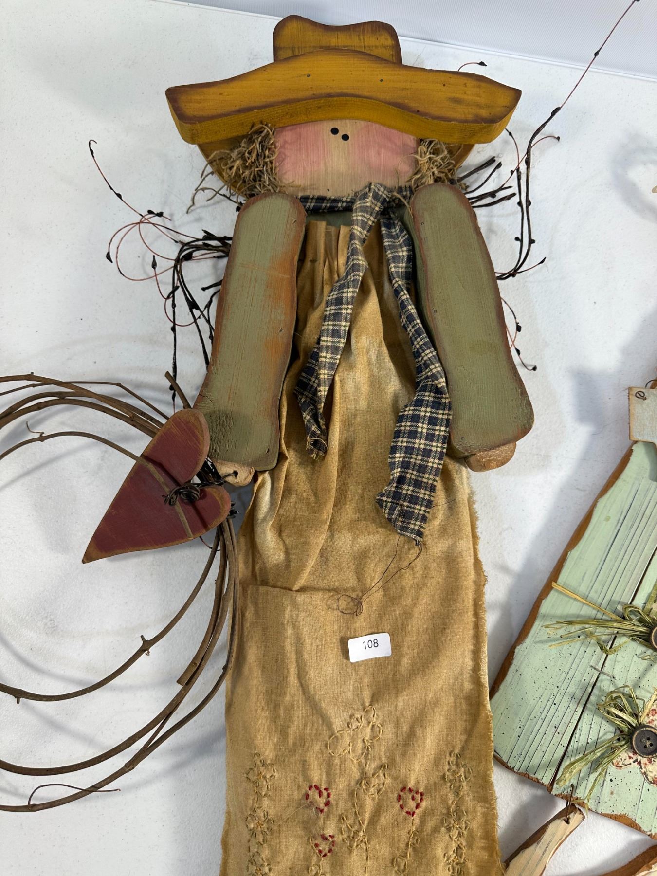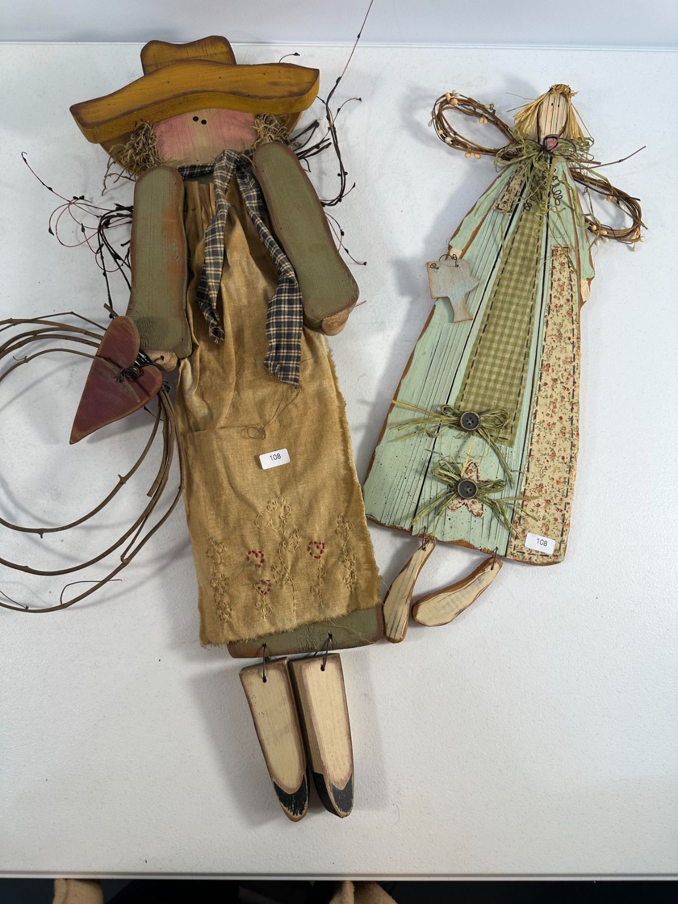 Charming rustic figures crafted from painted wood, fabric, and vine one angel and one farmer-style doll. Country farmhouse style décor. Hand-painted with fabric and twig accents. Each approximately mid-size; good vintage condition with intentional distressed look.