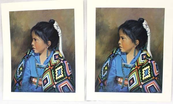 Pair of Prints by Joni Falk, One is Signed and Numbered, visuals measure 8'' x 10'', total measurements of 12'' x 10'', Native American Navajo Girl Subject Matter, the signed and numbered print is 12/250, FYI: Joni Falk realist painter of still life and landscapes, has lived in Phoenix, Arizona since 1960. Joni has become well known throughout the United States and Canada for her diversity of Subject from Traditional Floral still life's, Western still life's, Pueblo or Plains Indian Landscapes and Indian Figures. She is an award winning artist.''