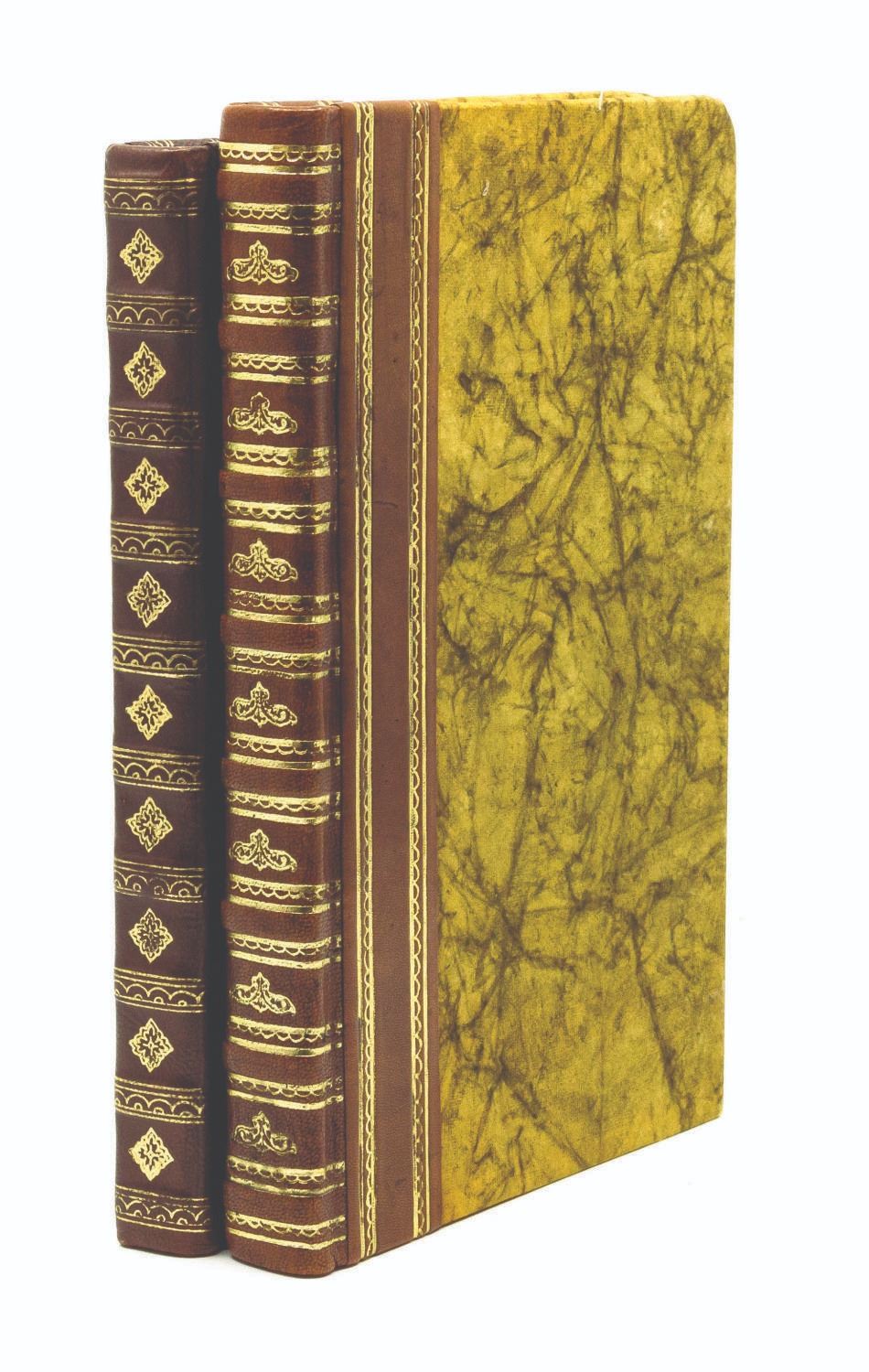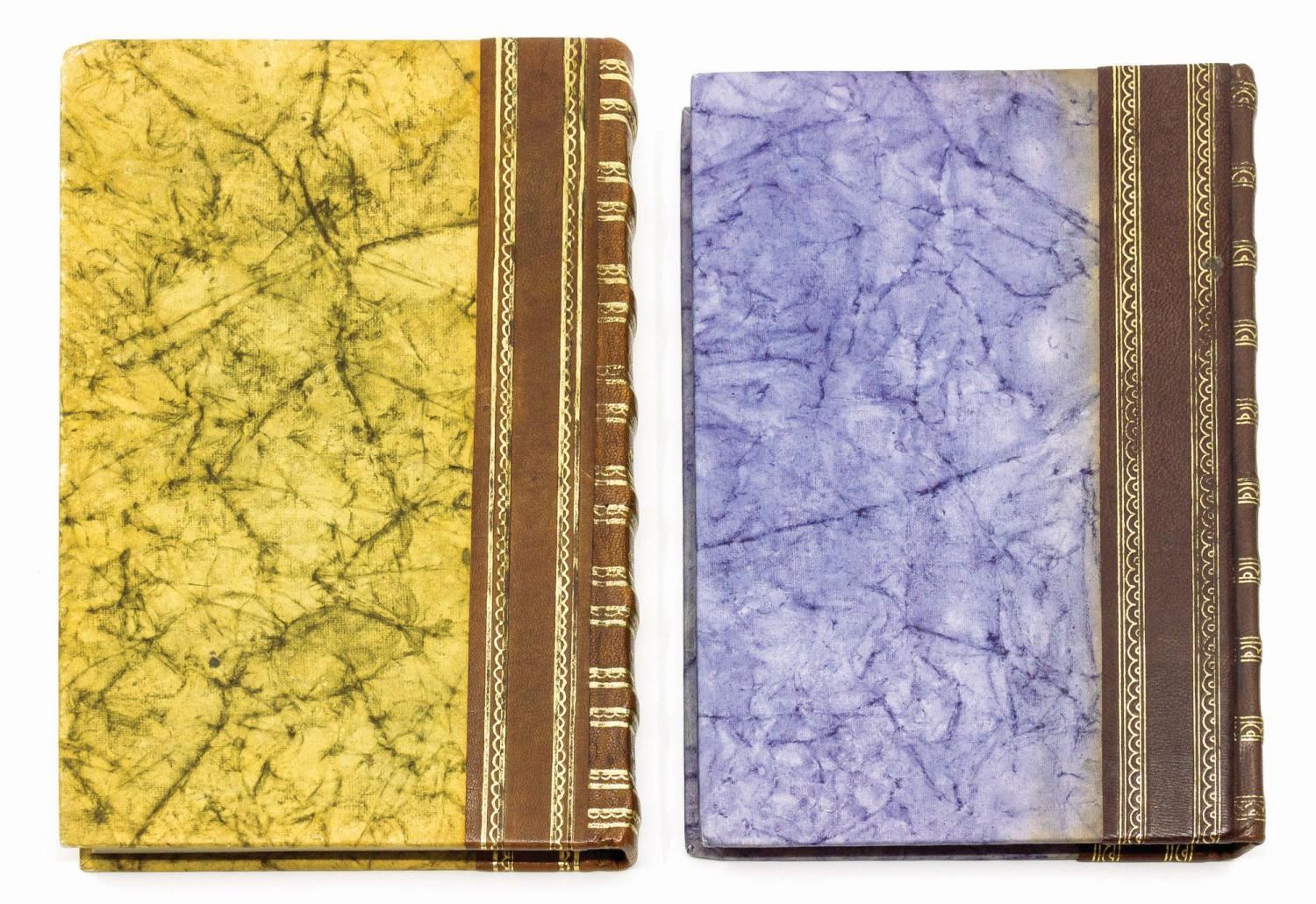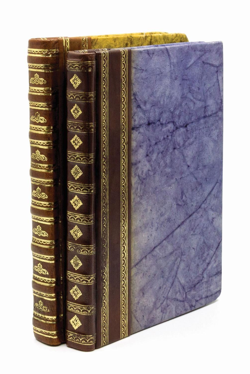(Paramount, 1989) A pair of static prop books from Indiana Jones and the Last Crusade, from the collection of a former studio employee. The quarter leather volumes feature stamped embellishments on the spines and marbled board covers, which have been adhered to the text block. These books were used as set decor in Henry Jones Sr.'s house, and later in Biblioteca di San Barnaba. Measuring 8.5"x5.75", the pieces are in very good condition with some minor production wear to the covers.