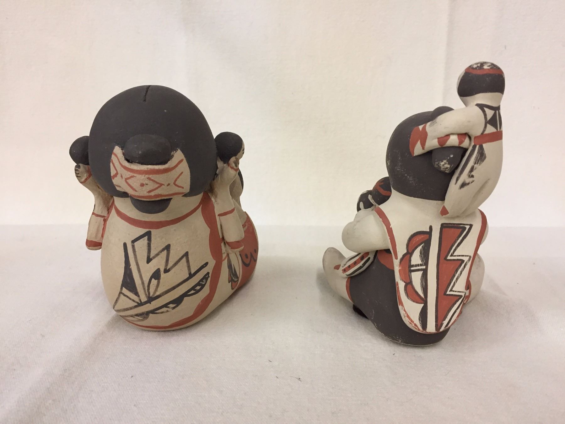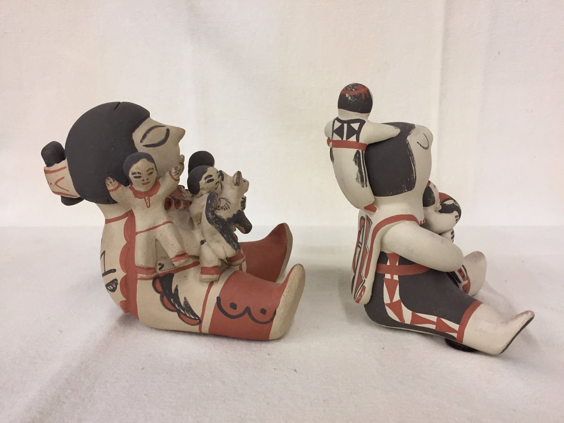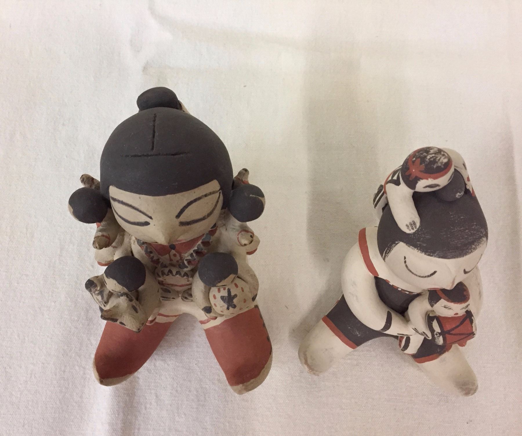Maker: Anita F. Toya, Cochiti and an unknown Jemez potter. Approx. Age: Circa 1980s. Size: Heights range from 5 5/8” to 5 1/2”. Additional Info: Pair of Pueblo storytellers 2 with 4 children. Condition: Pretty good for their age, some wear expected. Please look closely at the pictures - they are an important part of our description. Shipping: There will be a $8 handling / packaging fee for shipping this lot. The actual cost of postage will be added on top of that.