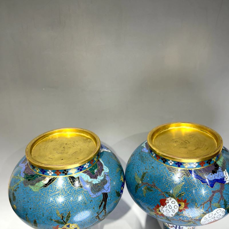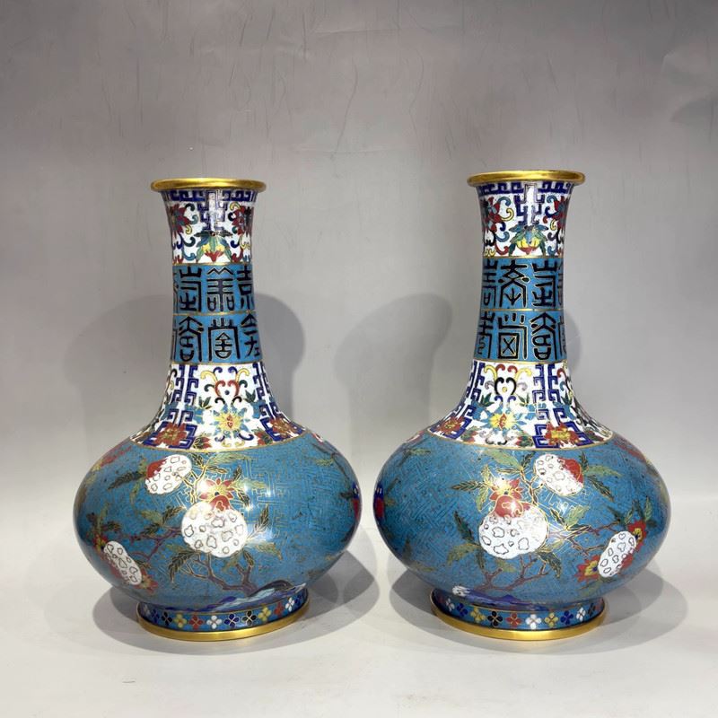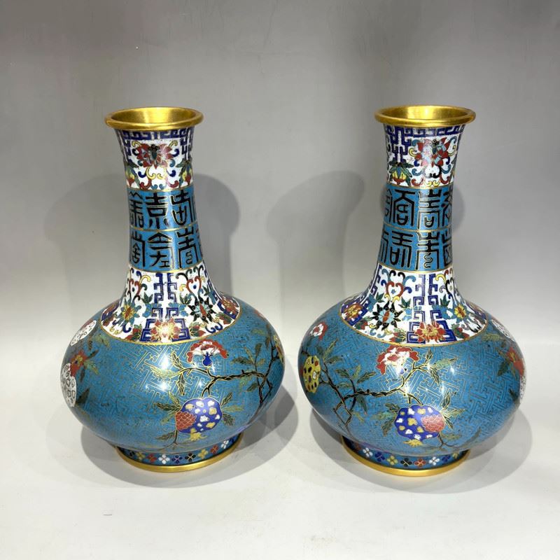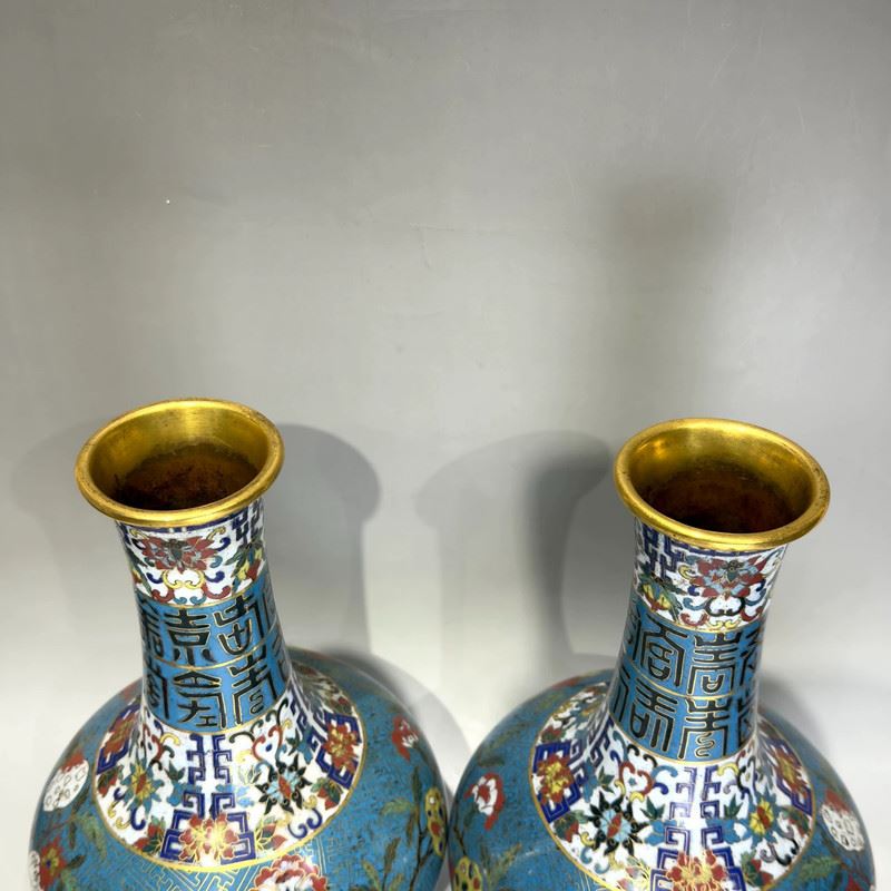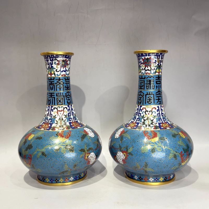 This pair of cloisonné enamel vases, with copper body and exquisite wire inlay, features a wide mouth, long neck, rounded shoulders, and bulbous body. The neck is decorated with stylized “Fu” (fortune) and “Shou” (longevity) characters, symbolizing blessings and longevity. The shoulders and body are adorned with vibrant scrolling floral motifs, with blossoms and foliage executed in rich enamels of yellow, red, green, and blue against a turquoise ground filled with geometric fret patterns. The foot rim is encircled with alternating floral and geometric designs, adding visual harmony. Such paired vases were typically displayed in halls, embodying auspicious wishes for prosperity, wealth, and longevity, representing the elegance of Qing cloisonné craftsmanship.