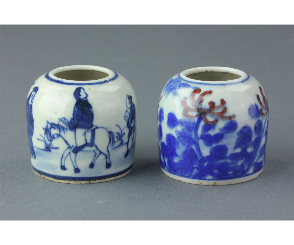 Pair of Chinese blue and white porcelain water pots; of bell shape with opening on top; featuring figures and flowers with copper red glaze on body; Qing period; H: 4.5 cm, D: 5 cm, 115 grams (both)