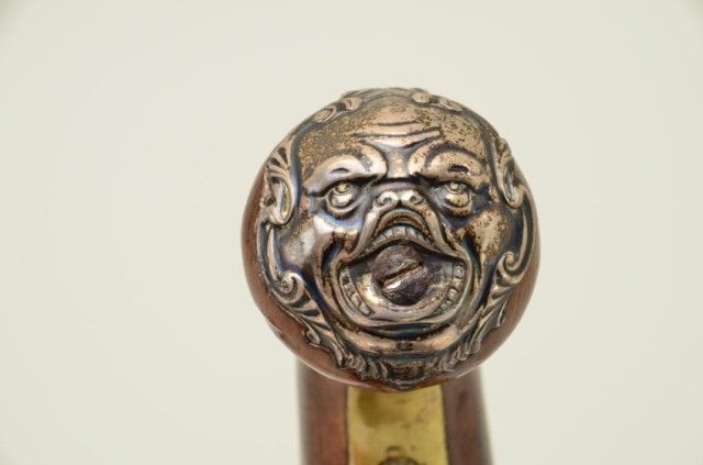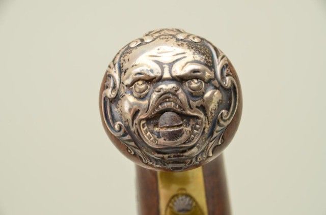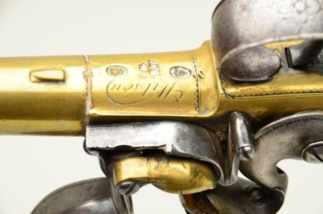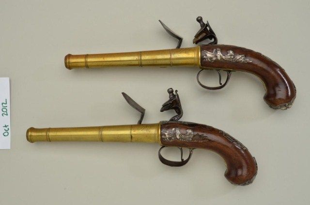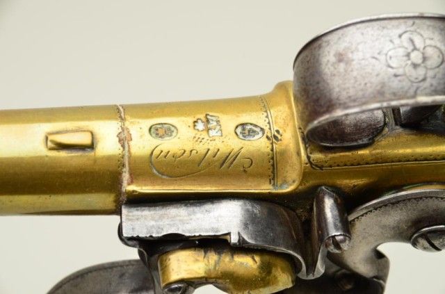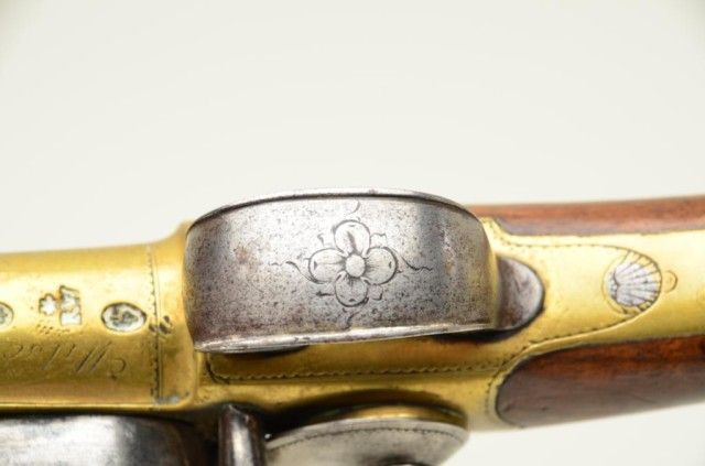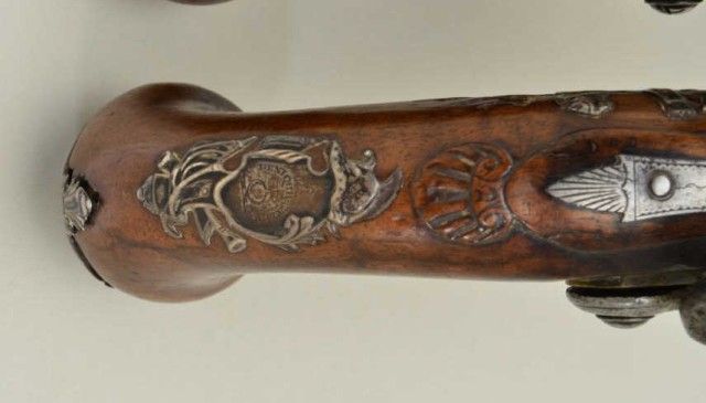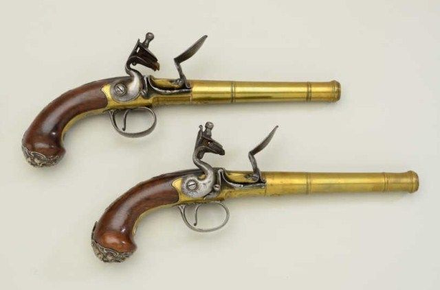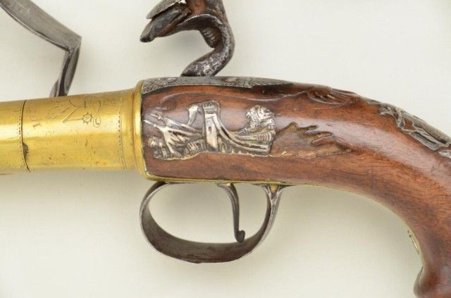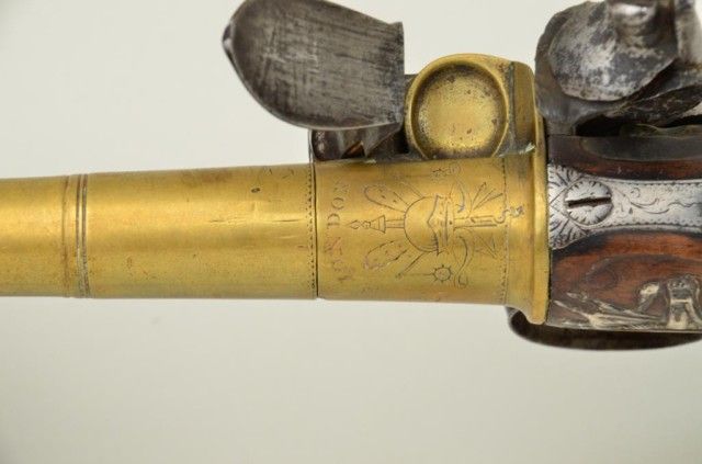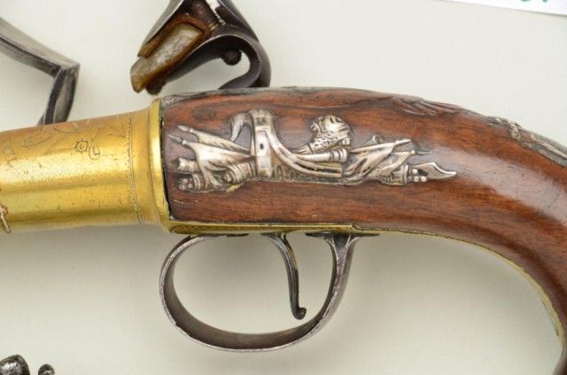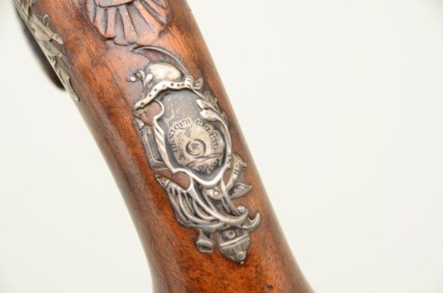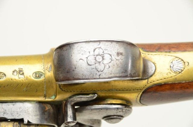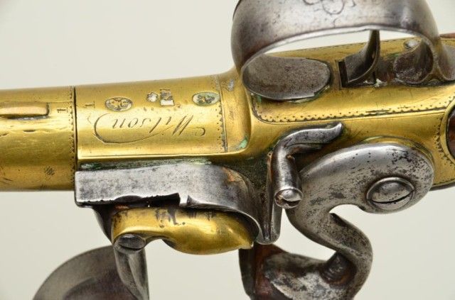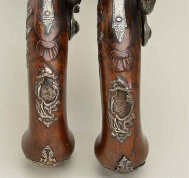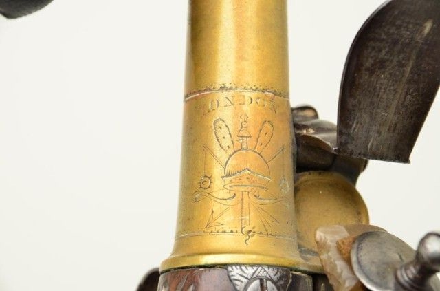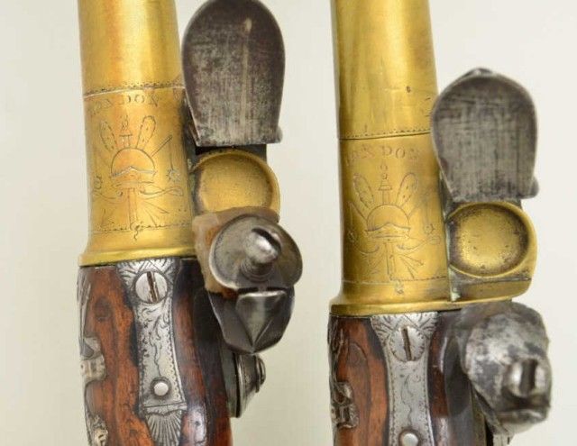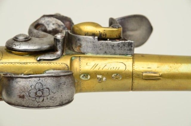 Pair of Queen Anne style flintlock pistols with brass barrels and frames signed Wilson, London. The pair are silver mounted with finely engraved crests on plaques inlaid at wrists. The pair measure 12-1/8” overall with 7-1/8” turned cannon type screw barrels of .62 smooth bore. The pair are fine quality and show beautiful engraving at the breeches with British proofs and R.W. barrel proof by Wilson. The butt caps show grotesque mask ofman and side plates show fancy stand of arms with flags and armor. The plaques at wrist are very fancy with Roman helmet, bugles and cannon engraved with the words “Deniquh Caelum” with a crescent moon resting on aplatform. The brass remains in very crisp condition with sharp engraving and well defined edges with no hard polishing. One hammer is an old replacement of a larger size. The stocks are very good plus withsharp shell design carving at the tangs. The silver mounts are also well defined with no over polishing. One end of side plate is broken and missing, a piece that measures about ¾” or about a third of side plate and