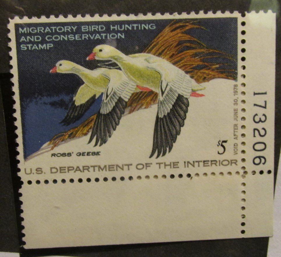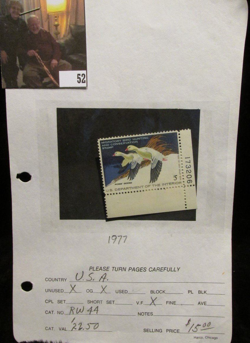 Pair of RW44 1977 $5 Federal Migratory Bird Hunting Stamp, plate number corner single (hinged) & a single (not hinged) both Mint unsigned.,