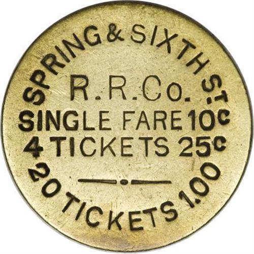 <B>Pair of Rare (1874) Los Angeles Transportation Tokens.</B></I> Brass, 23 mm. <B>Two</B></I> uniface tokens issued (1874) "Spring & Sixth St. R.R. Co. 20 Tickets 1.00 single tickets 10 cts 4 tickets 25 cts."<B> </B></I>The current sixth edition of the Atwood-Coffee catalog lists the pieces as Los Angeles 450 (65) A B 23 Sd, valued at $175 each.<BR><BR><b>Shipping:</b> Coins & Currency (<a target="_blank" href="http://www.heritageauctions.com/common/shipping.php">view shipping information</a>)