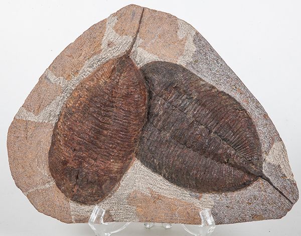 Pair of Rare Large Trilobites. Trilobites are one of the most popular fossils with collectors because of their strange appearance and attractiveness when well preserved with excellent detail on their hard shell parts. There are over 14,000 different species of trilobites which are arthropods and ancestors to insects and crustaceans. This pair of very large 6 inch 510 million year old dark brown trilobites are rare and belong to a recent discovery made in Essembra, South Morocco. Mucronaspis zagoraensis is very distinctive from most trilobites in that it has a very long tail spine (almost 2 inches). What also makes this 9 x 6.75 inch original slab special is the size of these trilobites at 6 inches including the tail spine. Usually only found as singles and only 2-3 inches long this pair is as large as this species gets. The dark brown color of the trilobites is nicely contrasted against the light brown and light gray matrix.