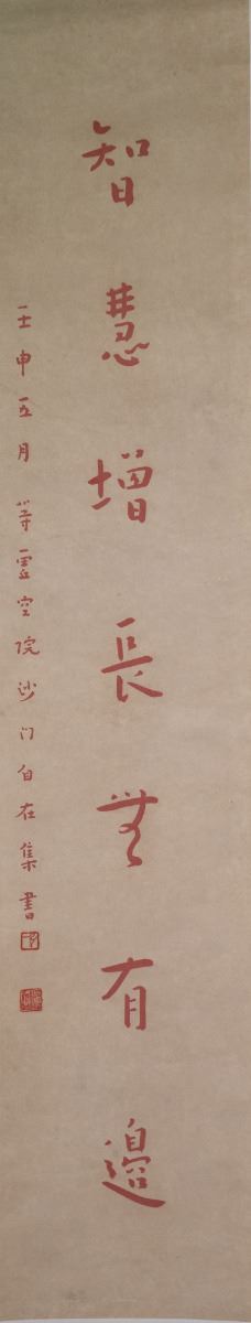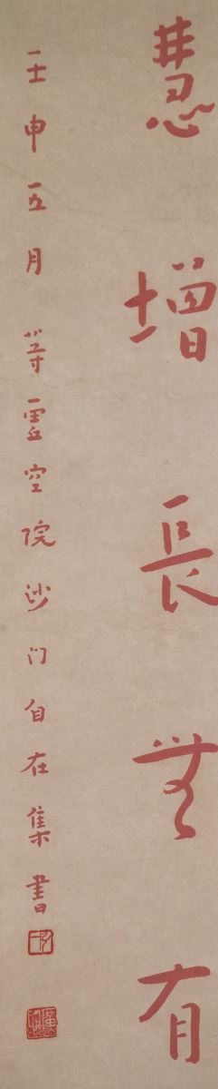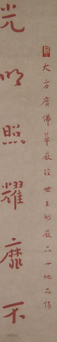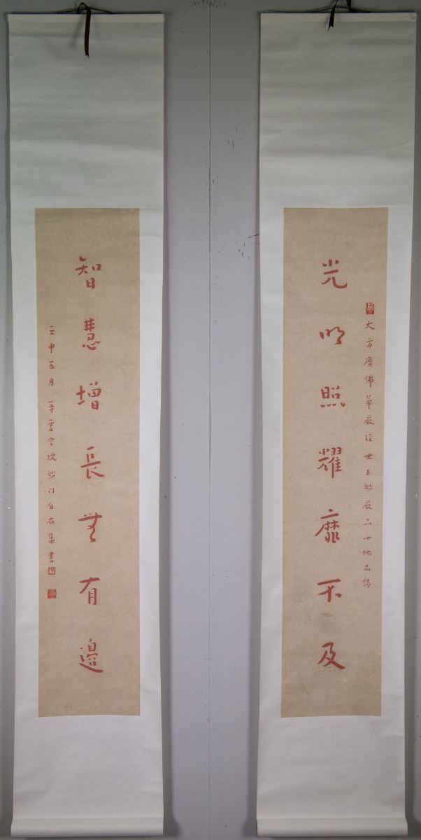 Pair of Script Calligraphy, Chinese ink on paper; signed Hong Yi (1880-1942) and inscribed with three artist seals; 112 cm x 22 cm each